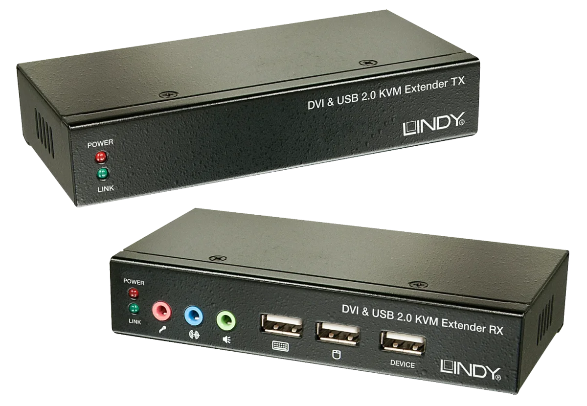 Der Lindy Cat.6 DVI-D Single Link, USB & Audio KVM Extender ermöglicht es dem Anwender, ein Quellgerät, beispielsweise einen PC, über eine bis zu 50m entfernte Konsole (Tastatur, Maus & Monitor) zu steuern. Er verwendet dazu zwei Cat.6-RJ45-Kabel und unterstützt DVI-Single-Link-Auflösungen bis 1920x1200 sowie HDMI-Signale einschließlich Full HD 1920x1080, 3D und HDCP 1.4. Der Extender besteht aus einer Transmitter- und einer Receivereinheit. Der Transmitter wird ans Quellgerät (z.B. ein PC oder KVM Switch) angeschlossen und die Konsole mit dem Receiver verbunden. Der Anschluss eines weiteren USB 2.0 Gerätes oder eines USB Hubs ist möglich, um so remoteseitig zusätzliche USB-Peripherie wie Massenspeicher oder Drucker verbinden zu können.