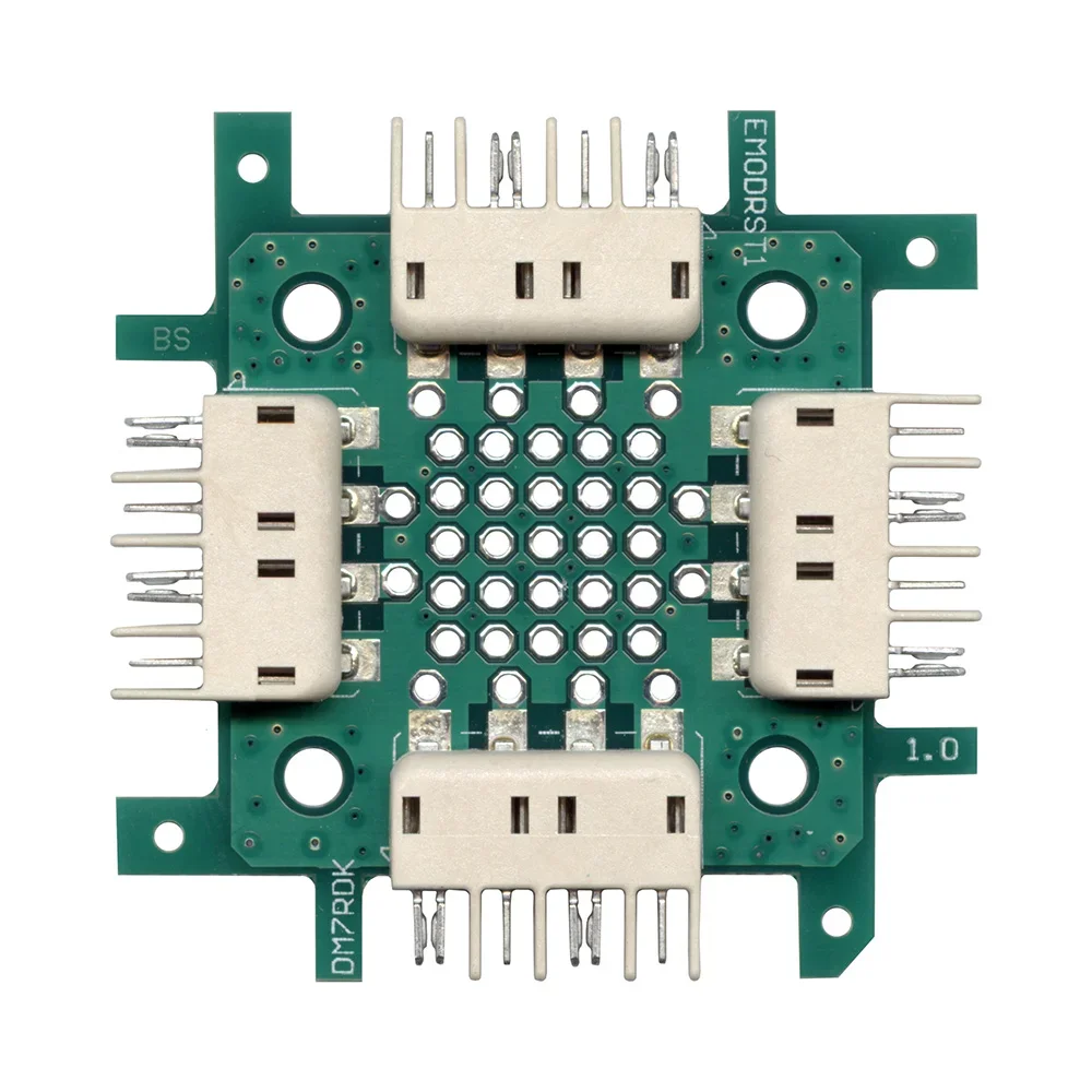 Platine zum selbstbestücken. Von jedem Stecker sind die beiden mittleren Kontakte einzeln auf der Platine verfügbar. In der Mitte der Platine ein Lochrasterfeld mit 2,54mm Raster. Auf der Unterseite SMD Pads mit 1,27mm Raster.