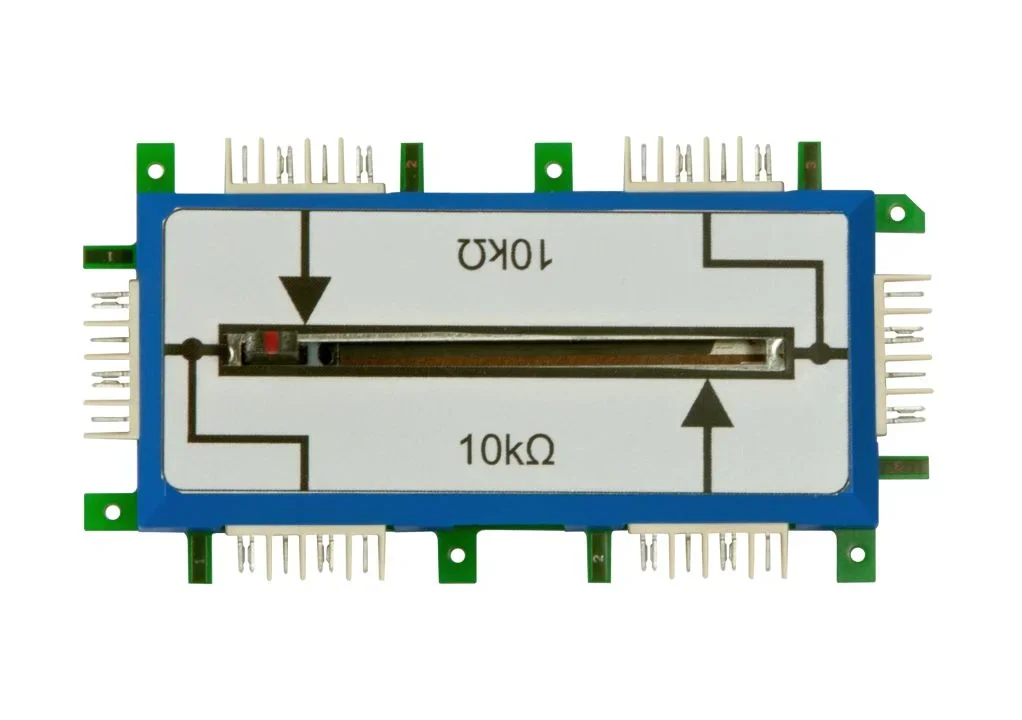 Das Potentiometer ist ein Widerstand mit einem veränderbaren Abgreifer. Es hat drei Anschlüsse. Der Widerstand bezieht sich auf den Wert der festen Größe. Der Abgreifer kann mechanisch bewegt werden und liefert einen Wert zwischen dem geringsten und maximalen Widerstandswert an der dritten Klemme. Das Potentiometer hat auch eine maximale Leistung - bei uns ca. 1/8 Watt - die leicht überschritten werden kann, wenn man den Abgreifer direkt mit der Spannungsquelle und einem der anderen beiden Anschlüsse verbindet.