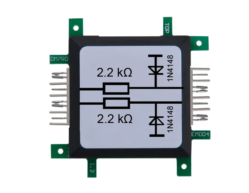 Doppelwiderstand mit Schutzdioden. Speziell zum Schutz der analogen Eingänge des Arduino Nano. Die Dioden müssen in Richtung des Arduino Nano Bricks angeschlossen werden. Sie schützen vor negativen Spannungen. Im Nano Brick selbst sind auch nochmal zwei Widerstände mit ca. 100 Ohm untergebracht. Die 2.2KOhm Widerstände können die Eingänge auch vor 9V Spannung schützen.
