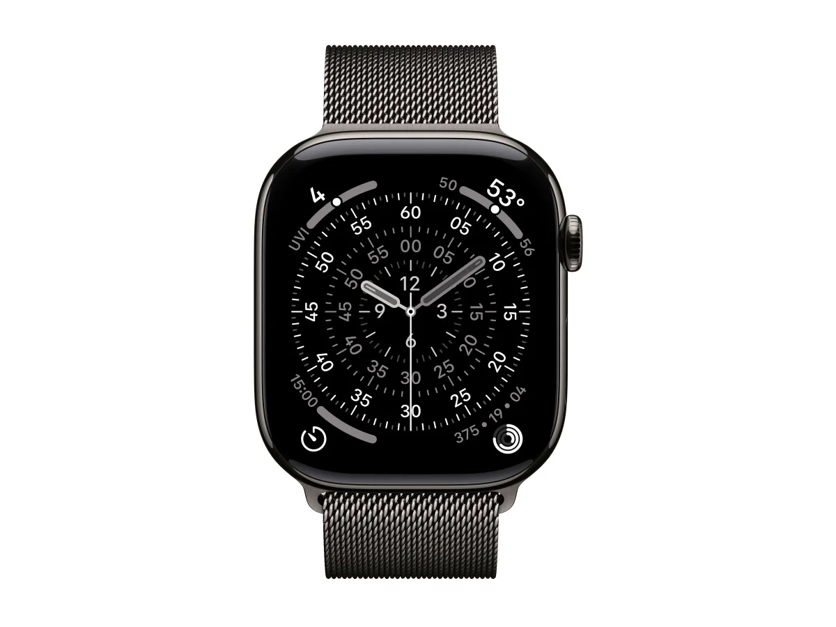 Apple Watch Series 11 (GPS + Cellular) - 46 mm - Schiefer-Titan - intelligente Uhr mit Milanaise Armband - Edelstahl-Mesh - Schiefer - Bandgröße: M/L - 64 GB - LTE, Wi-Fi 4, UWB, Bluetooth - 5G - 43.1 g