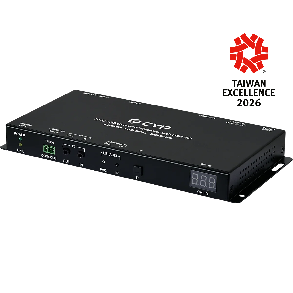 4K@60 1Gbps AV over IP transmitter in Unicast or Multicast mode., IP interface: RJ45, Supports comprehensive USB over IP functionality (USB flash drive, keyboard and mouse) and seamless collaboration across multiple windows, Supports PoE-PD (IEEE 802.3af)., Support IP to IR/ RS-232, converting the IP signal into IR and RS-232 commands for device control., Controlled via hotkey, WebGUI, IP Master Controller, and Telnet, Supports the use of an external control center (IP Master Controller) to provide expanded functionality (Contact your authorized dealer for more information), 7 hotkeys dedicated to routing for transmitters and receivers, 4 hotkeys provide single functions, and 3 hotkeys for multiple functions that activates control system, Supports independent breakaway A/V and control matrix routing, Supports extension of many audio formats including 8 channel LPCM and standard BitstreamNote: The Line Out only supports LPCM 2.0 sources., The analog Line In is automatically embedded in the streaming output and can be independently routed to any receiver, The Mic In sends audio directly to the analog Line Out on the currently routed transmitterNote: Only available when the transmitter also has its Line In connected., Optional Dante ReadyTM is compatible with existing Dante and AES67 audio networks, Dante Ready brings Dante functionality to products already shipping and installed in sites, Channels and features can be added as an installation grows