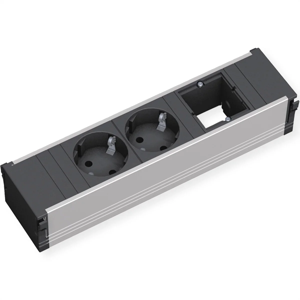 CONI ALU Steckdosenleiste mit erhöhtem Berührungsschutz Länge: 3-fach / 217mm 2xSchutzkontaktsteckdosen schwarz 1xCustom Modul leer Stromeingang: 0,2m H05VV-F 3G1,5mm² schwarz mit Wieland GST18 Steckverbinder