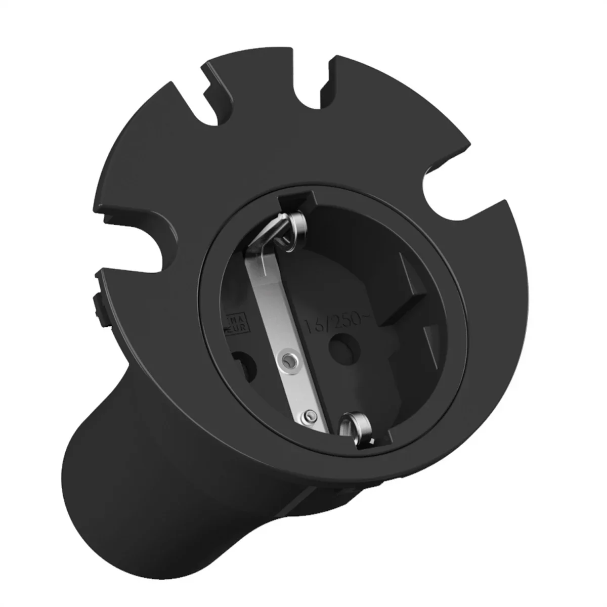 kann schnell und einfach montiert werden und bietet neben der praktischen Kabeldurchführungsfunktion für verschiedene Kabelstärken eine Schutzkontaktsteckdose, verpackt in modernem, elegantem Design. Einfach einsetzen und verriegeln – fertig! Der Einsatz eignet sich ideal überall dort, wo Strom benötigt und dem Kabelsalat ein Ende gesetzt werden soll. Für hochwertigere Varianten mit Metall-Finish kann LOOP IN in Verbindung mit LOOP ROUND eingesetzt werden.