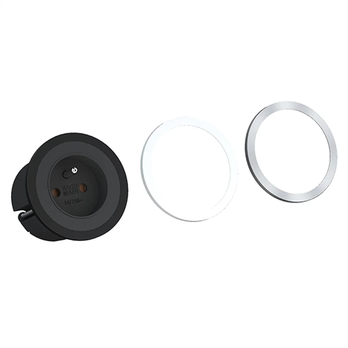 PIX Steckdose mit erhöhtem Berührungsschutz 1xUTE Steckdose Frankreich schwarz schwarzer Zierring montiert, weißer Zierring und Zierring in Edelstahl- Optik zusätzlich beiliegend Zuleitung 2,0m H05VV-F 3G1,5mm² schwarz mit Aderendhülsen und beigelegtem Montagestecker mit POS Verpackung
