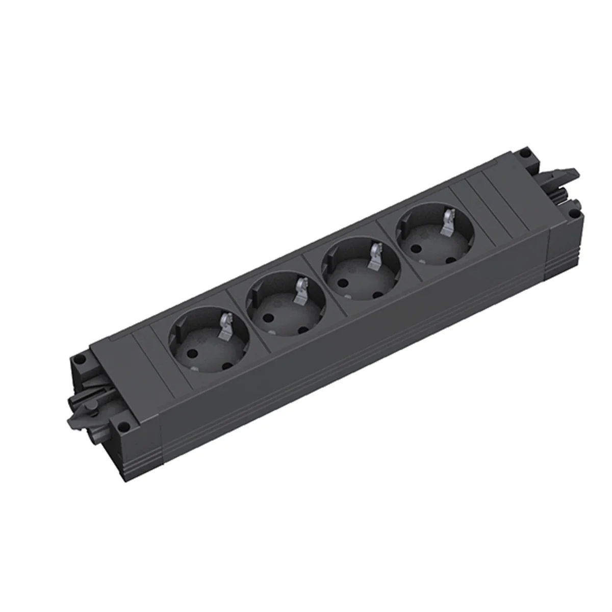 STEP BASE Steckdosenleiste Kunststoffprofil schwarz mit erhöhtem Berührungsschutz 4xSchutzkontaktsteckdosen 35° schwarz Stromeingang und -ausgang GST18 mit BACHMANN Logo verpackt im Karton