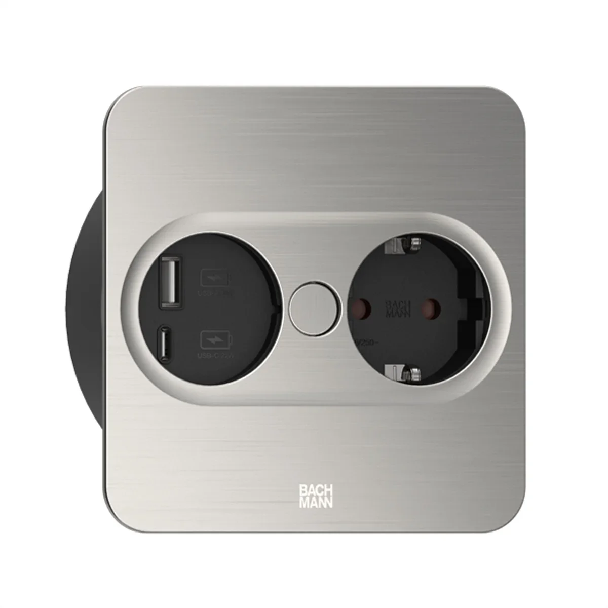 TWIST 2 Metallische Abdeckscheibe eckig Edelstahl-Optik 1xSchutzkontaktsteckdose schwarz mit erhöhtem Berührungsschutz 1xUSB A/C 22W Charger Zuleitung 2,0m H05VV-F 3G1,5mm² schwarz mit Aderendhülsen und beigelegtem Schutzkontakt-Montagestecker verpackt im Karton
