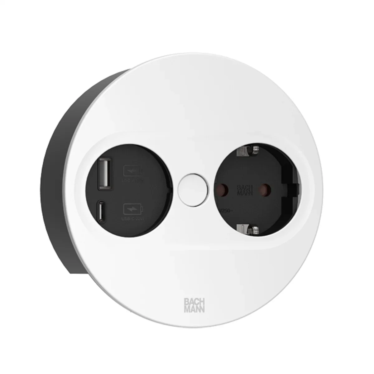 TWIST 2 Metallische Abdeckscheibe rund weiß matt, ähnlich RAL9010 30GE seidenmatt 1xSchutzkontaktsteckdose schwarz mit erhöhtem Berührungsschutz 1xUSB A/C 22W Charger Zuleitung 2,0m H05VV-F 3G1,5mm² schwarz mit Aderendhülsen und beigelegtem Schutzkontakt-Montagestecker verpackt im Karton