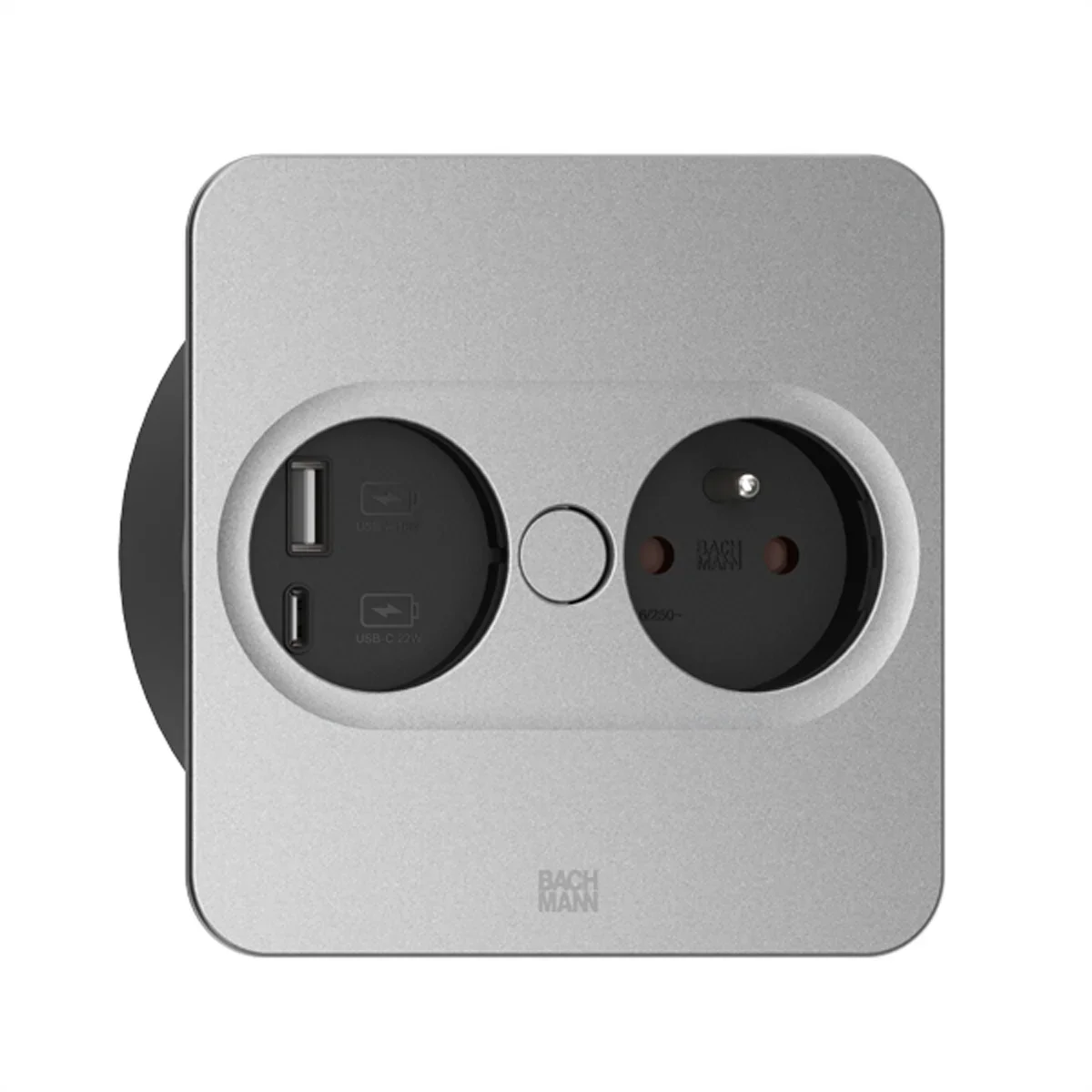 TWIST 2 Metallische Abdeckscheibe eckig Silber matt lackiert 1xUTE Steckdose Frankreich schwarz mit erhöhtem Berührungsschutz 1xUSB A/C 22W Charger Zuleitung 0,2m H05VV-F3G1,5mm² schwarz mit GST18 Stecker schwarz verpackt im Karton