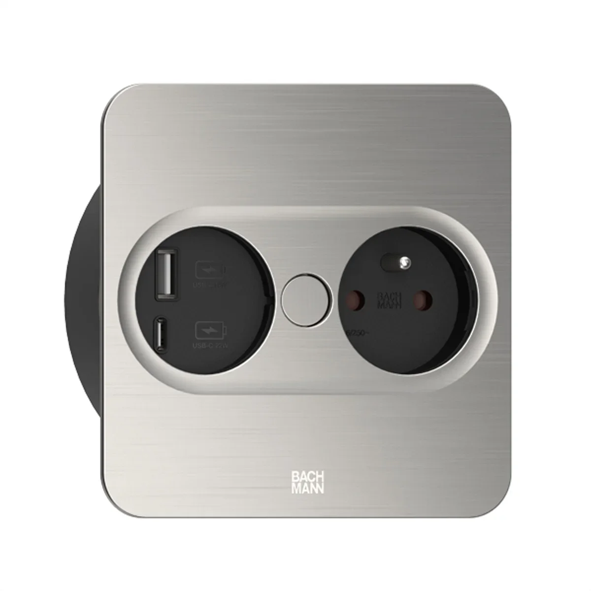 TWIST 2 Metallische Abdeckscheibe in Edelstahl-Optik eckig 1xUTE Frankreich Steckdose schwarz mit erhöhtem Berührungsschutz 1xUSB A/C 22W Charger Zuleitung 2,0m H05VV-F 3G1,5mm² schwarz mit Aderendhülsen und beigelegtem Schutzkontakt-Montagestecker verpackt im Karton