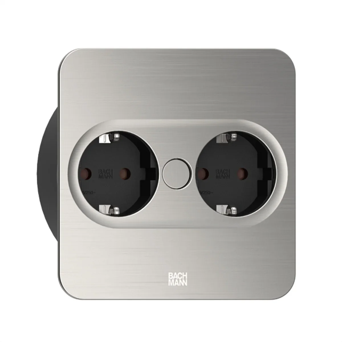 TWIST 2 Metallische Abdeckscheibe in Edelstahl-Optik eckig 2xSchutzkontaktsteckdosen schwarz mit erhöhtem Berührungsschutz Zuleitung 2,0m H05VV-F 3G1,5mm² schwarz mit Aderendhülsen und beigelegtem Schutzkontakt-Montagestecker verpackt im Karton