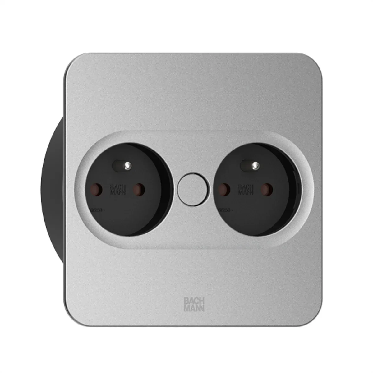 TWIST 2 Metallische Abdeckscheibe eckig Silber matt lackiert 2xUTE Steckdosen Frankreich schwarz mit erhöhtem Berührungsschutz Zuleitung 2,0m H05VV-F 3G1,5mm² schwarz mit Aderendhülsen und beigelegtem Schutzkontakt-Montagestecker verpackt im Karton