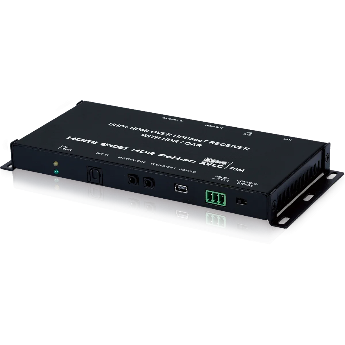 This HDMI over single Cat.5e/6/7 Receiver is a great solution for extending HD audio and video as well as Ethernet and control via a single run of Cat.5e/6/7 cable over distances of up to 100 meters. Multiple data and control interfaces are provided, including IR, RS-232 and LAN connections. This Receiver complies with the advanced HDCP 2.2 and HDMI 2.0 standards, as well as supporting the legacy HDCP 1.x and HDMI 1.x standards. Despite HDBaseT’s 10.Gbps bandwidth limitation, 4K UHD HDMI video sources, up to and including 4K@60Hz (4:4:4, 8-bit) as well as 10/12-bit sources with HDR, are able to be processed and extended by the use of AVLC (Adaptive Visually Lossless Compression) when connected to a compatible AVLC Transmitter. Beyond video, data, and control this unit also contains useful audio features. The Optical Audio Return (OAR) feature supports transmitting optical audio back to a compatible Transmitter for local playback. Rounding out the feature set is automatic TMDS re-clocking support. This Receiver (PD) is powered by 48V PoH (Power over HDBaseT) from a compatible Transmitter (PSE), allowing for flexibility within different installation scenarios.