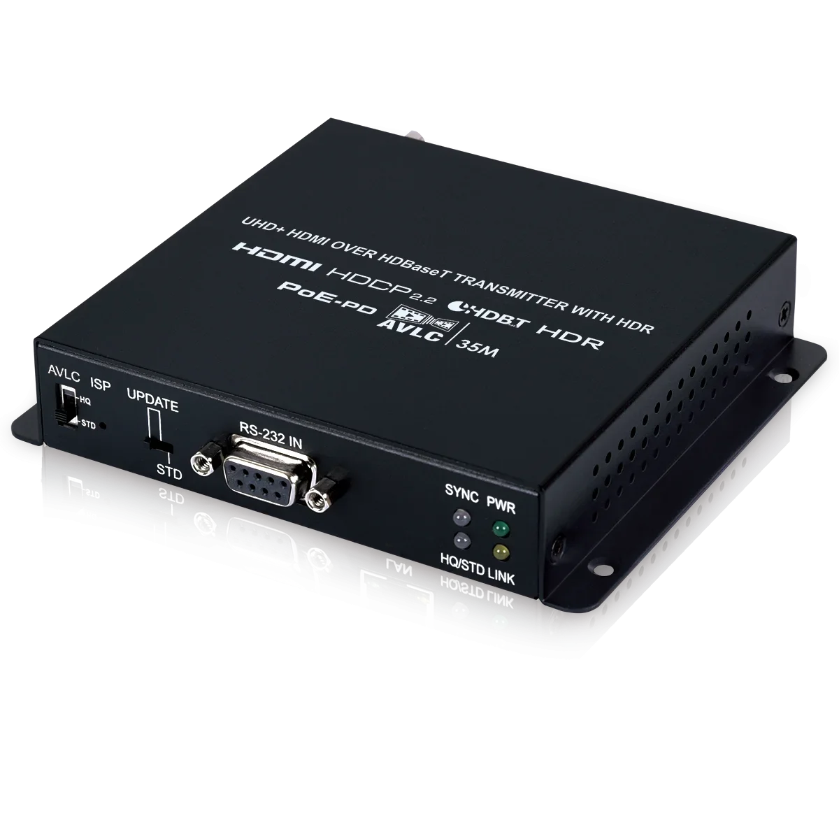 This Transmitter is a great solution for extending UHD video and audio as well as control via a single run of Cat.5e/6/7 cable over distances up to 35 meters. This Transmitter complies with the advanced HDCP 2.2 and HDMI 2.0 standards, as well as supporting the legacy HDCP 1.x and HDMI 1.x standards. Despite HDBaseT’s 10.2Gbps bandwidth limitation, 4K UHD HDMI video sources, up to and including 4K@60Hz (4:4:4, 8-bit) as well as 10/12-bit sources with HDR, are able to be processed and extended by the use of AVLC (Adaptive Visually Lossless Compression) when needed. Multiple data and control interfaces are also provided, including IR, and RS-232 connections. This Transmitter (PD) is powered by 48V PoH (Power over HDBaseT) from a compatible Receiver (PSE), allowing for greater flexibility within different installation scenarios.