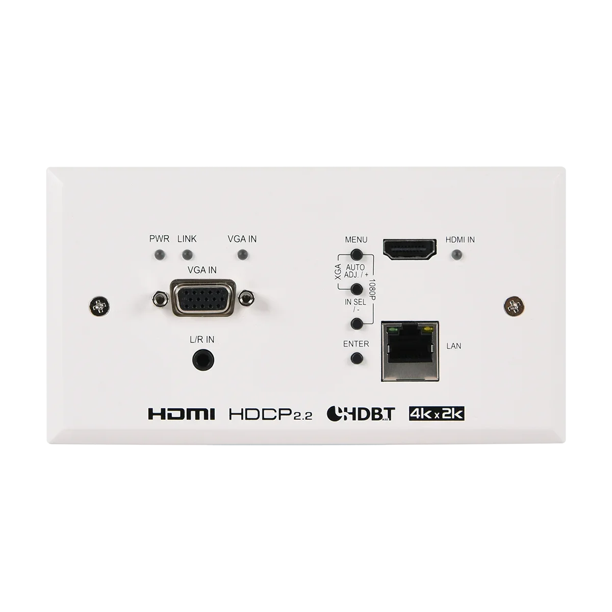 Supports VGA input resolutions up to WUXGA (RB), Simultaneous transmission of uncompressed video, audio and data over a single 100m Cat.5e/6/7 cable at 1080p and 70m at 4K, Automatic input selection with hot plug detection enabling hands- free operation, Unit may be powered locally or via 48V PoH (PD) from a compatible HDBaseT Receiver (PSE), Wall plate is designed for EU two-gang sized enclosures, Front panel LEDs indicate input selection, power and link status