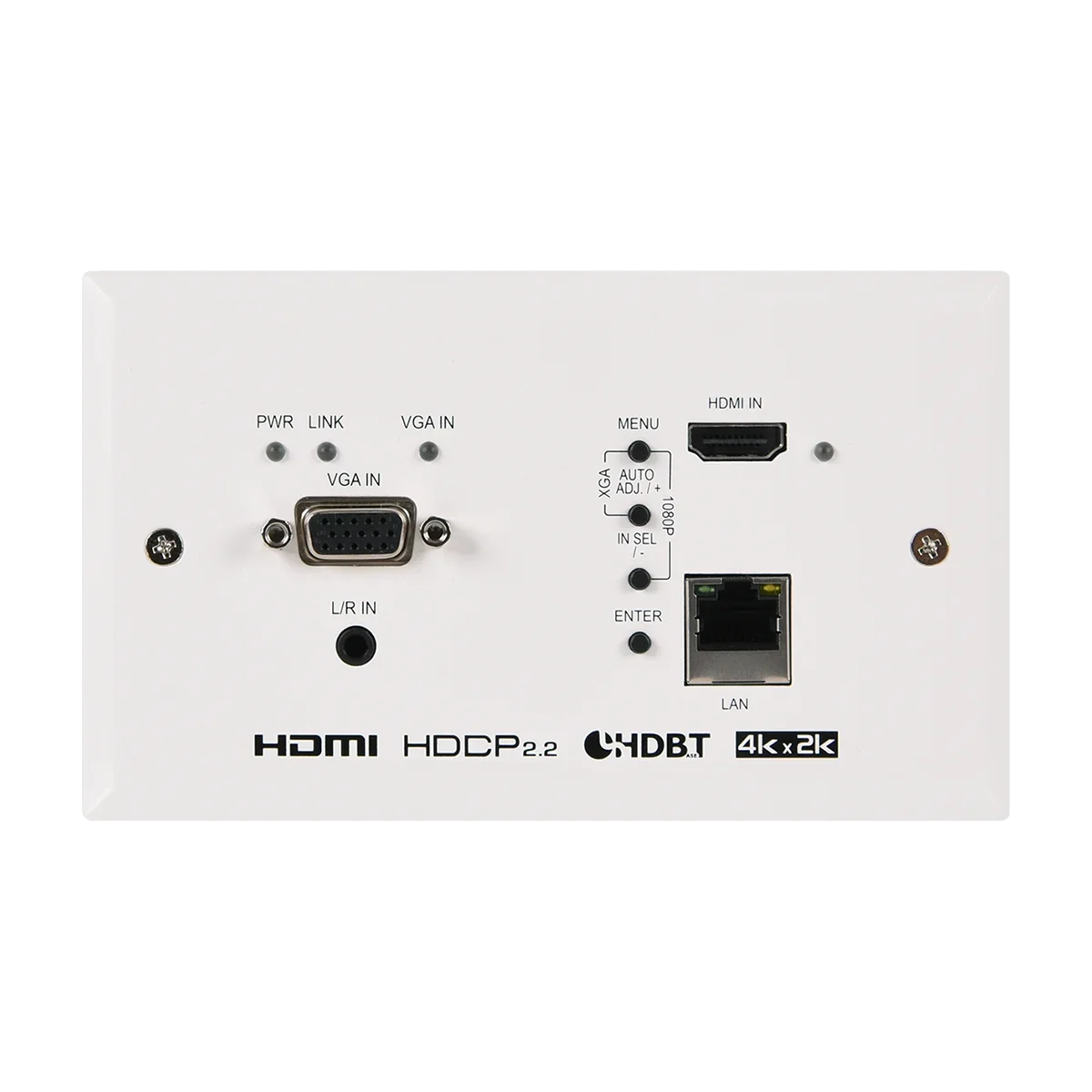 This UHD Wallplate Scaler is an HDMI/VGA switch with audio embedding and scaled HDBaseT output. The wall plate is designed for use with EU or UK twogang sized enclosures. It is suitable for various installation requirements with aesthetic considerations. The HDMI input supports resolutions up to 4K@60Hz (4:4:4, 8-bit). The VGA input supports resolutions up to WUXGA (RB) and with the use of the associated 3.5mm audio input, stereo audio may be embedded as well. To provide maximum compatibility with a wide range of display types, all sources are scaled to a user-selected resolution and timing (up to 4K@30Hz) for transmission over HDBaseT. This unit also supports automatic input selection between the HDMI and VGA inputs, with hot plug detection, enabling hands-free operation. Additionally, the unit may be powered locally or via 48V PoH (Power over HDBaseT) from a compatible HDBaseT Receiver, which allows for greater flexibility in installations. The unit is controllable via front panel controls with an OSD or RS-232 (via the RS-232 port on a compatible Receiver).