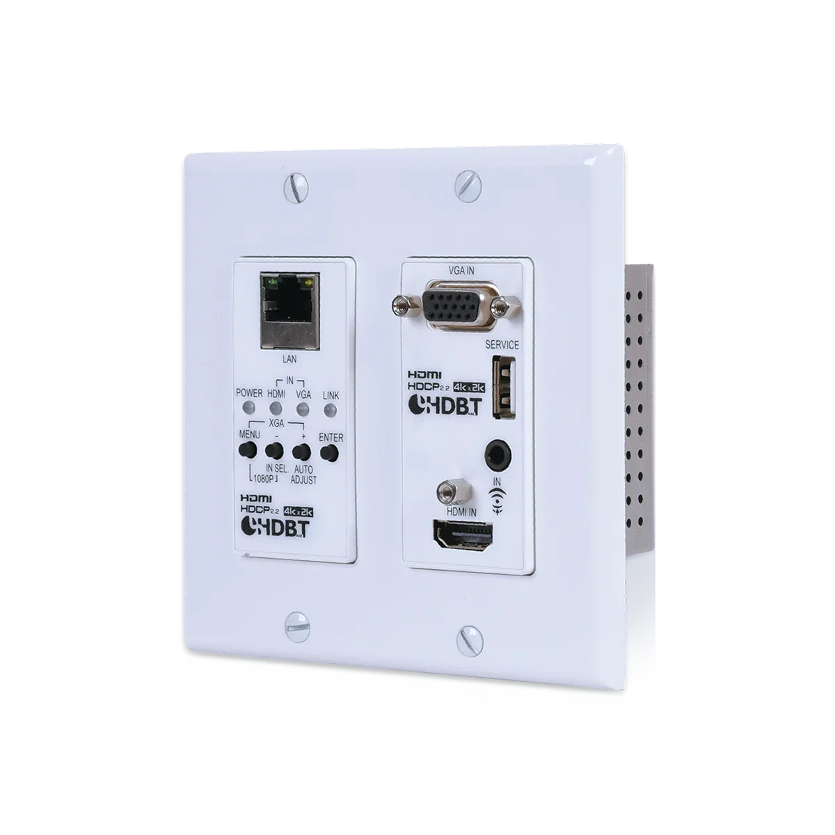 Wallplates designed for US two-gang sized enclosures, HDBaseT feature support: HD Video and Audio, 100BaseT Ethernet, and PoH (PD), HDBaseT output transmits video, audio, and data over a single Cat.5e/6/7 cable and can reach distances up to 100m/328ft at 4K when using Cat.6a/7, Supports pass-through of many audio formats including LPCM 2.0/5.1/7.1, Bitstream, and HD Bitstream, Supports CEC bypass, Unit may be powered locally or via 48V PoH from a compatible HDBaseT Receiver (PSE), Supports manual input selection or automatic input selection with hot plug detection, Basic signal event automation (via RS-232 w/ compatible Receiver), Controllable via a front panel buttons with OSD, or RS-232 (w/ compatible Receiver only)