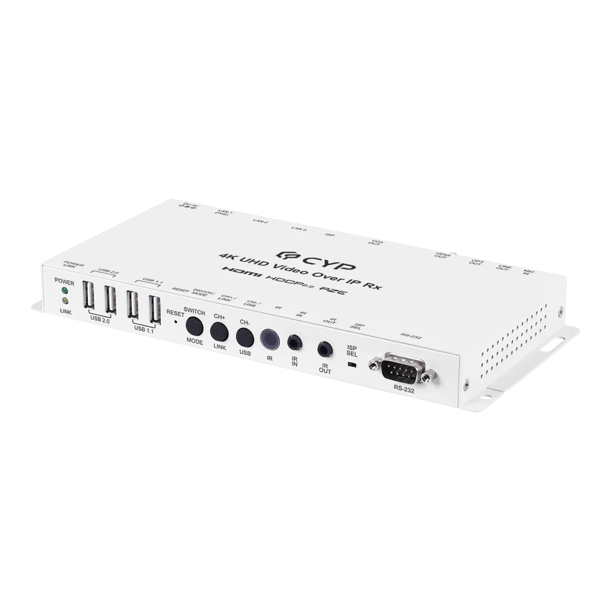 Video, audio and control reception over TCP/IP in Unicast (point-to-point) or Multicast (single-to-many, many-to-many) modes, Support video wall with 180° and 270° rotation, Video output can be scaled to a selected resolution, or left unscaled, The analog Line In on a connected Transmitter will send audio directly to this Receiver’s analog Line Out as well as being embedded into the HDMI output signal, The Mic In on the Receiver sends audio directly to the analog Line Out on the Transmitter, May be powered directly by PoE when connected to a Gigabit Ethernet switch that provides PoE (802.3af), Includes 3 LAN ports, allowing multiple Receivers to be daisy chained without the need for an external Gigabit Ethernet switch, Supports USB keyboard, mouse and storage extension