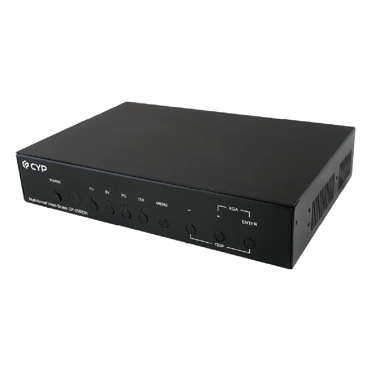 This Multi-Format to DVI Scaler is capable of scaling and switching from Composite Video, S-Video, PC (VGA) and DVI input signals to a DVI output. A corresponding analog stereo audio input can be switched and sent to the stereo audio output with the video source selection. It has the added benefit of control through front panel buttons, IR remote, or RS-232, and there is on-screen menu (OSD) providing setting selection and system information. The device provides a full range of output resolutions, up to 1080p for HDTV resolutions, and WUXGA (RB) for PC resolutions.