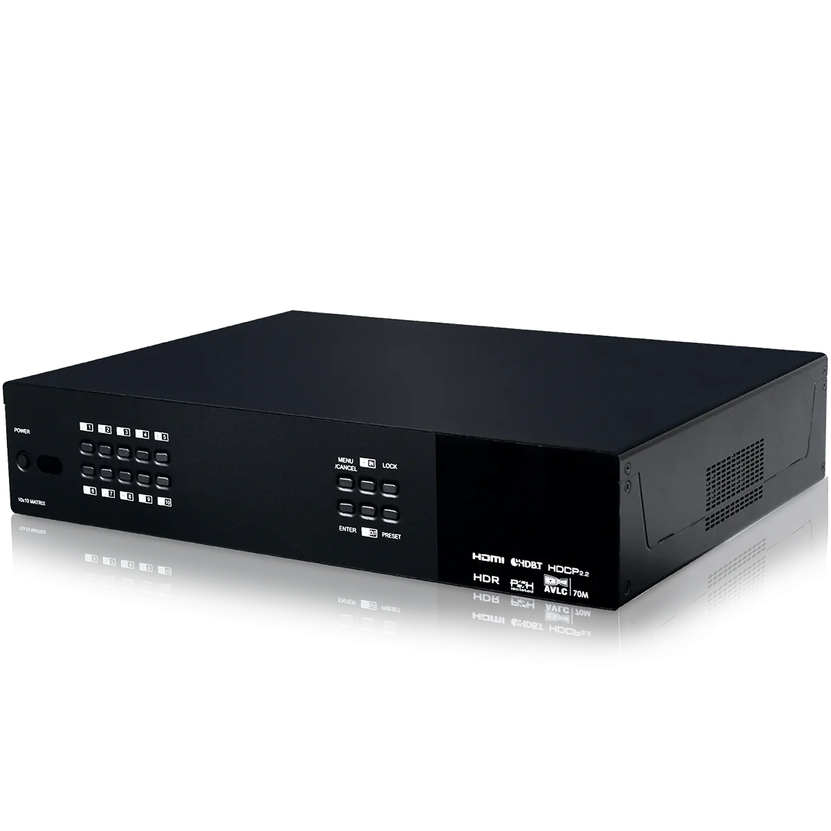 Routes ten HDMI sources to ten displays using eight HDBaseT outputs and two independent or mirrored HDMI outputs, Supports Deep Color input and output up to 12-bit , Supports 10-bit and 12-bit HDR bypass, Supported HDBaseT feature set: HD Video & Audio, 100BaseT Ethernet, 48V PoH, and Control (Bidirectional IR/RS-232 pass through), All HDBaseT outputs support OAR (Optical Audio Return), 4K signals can be transmitted up to 70m via Cat.5e/6 and up to 100m via Cat.6a/7, Supports pass-through of these standard digital audio formats via HDMI/HDBaseT: LPCM 2.0/5.1/7.1, Bitstream, and HD Bitstream, Advanced DAC (Digital to Analog Conversion) and ADC (Analog to Digital Conversion) for audio integration, Supports integrated audio over CAT inputs and outputs for transmission up to 300m, Supports volume, treble, bass, and audio delay for lip-sync (up to 230ms) on analog audio outputs and mute on all outputs, Audio mixer functionality (three mixers in total), Advanced internal and external EDID management with 4 sets of configurable EDID settings, Internal test pattern generation (up to 1080p) for self and sink testing, 2U rack mounted design, Control via front panel buttons with OLED menu, Ethernet (Telnet & WebGUI), RS-232, and IR remote