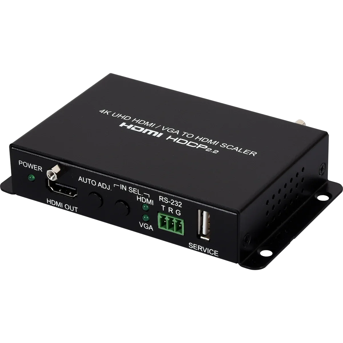 Switchable HDMI input and VGA input with a 3.5mm analog stereo audio input , Supports up to 4K UHD (18Gbps, 4K@50/60Hz 4:4:4, 8-bit) video input and output over HDMI , Supports up to 1080p or WUXGA (1920x120060Hz RB) video input over VGA , Auto input switching by detecting HDMI/VGA signal. , Output preferred resolution of connected display(NATIVE mode) , Comprehensive output picture adjustments via RS-232 (contrast, brightness, hue, saturation, sharpness, RGB (color tone) level and aspect ratio size) , Supports LPCM 2.0 digital/analog audio input and output