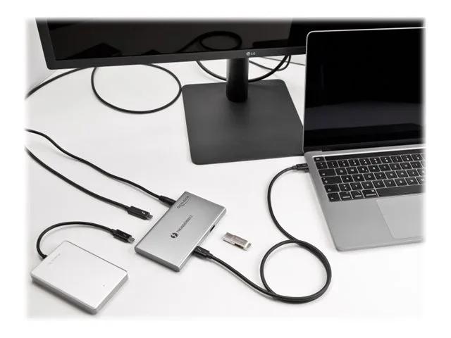 Dieser stabile Thunderbolt 4 Hub von Delock im Metallgehäuse wird an einen Computer oder Notebook über den Thunderbolt Anschluss angeschlossen. Er erweitert den Computer um drei Thunderbolt 4 Anschlüsse und eine SuperSpeed USB Typ-A Buchse.