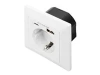 Mit der DIGITUS Schutzkontakt-Steckdose können Sie sogar 2 Smartphones zeitgleich aufladen. Laden Sie ein USB-C oder USB A Gerät mit bis zu 14 W (5 V / 2,8 A). Laden Sie beispielsweise gleichzeitig Ihr Smartphone und Ihr Tablet mit insgesamt 2,8 A verfügbarem Ladestrom. Schützen Sie sich und Ihre Familie durch die integrierten Shutter in der Steckdose, die einen erhöhten Berührungsschutz gewährleisten und zusätzlich durch den eingebauten elektronischen Kurzschluss- und Überlastschutz der USB-Ports. Rüsten Sie Ihre vorhandene Elektroinstallation auf und kommen Sie in den Genuss, jederzeit Ihre USB-Geräte direkt an der Steckdose aufladen zu können.
