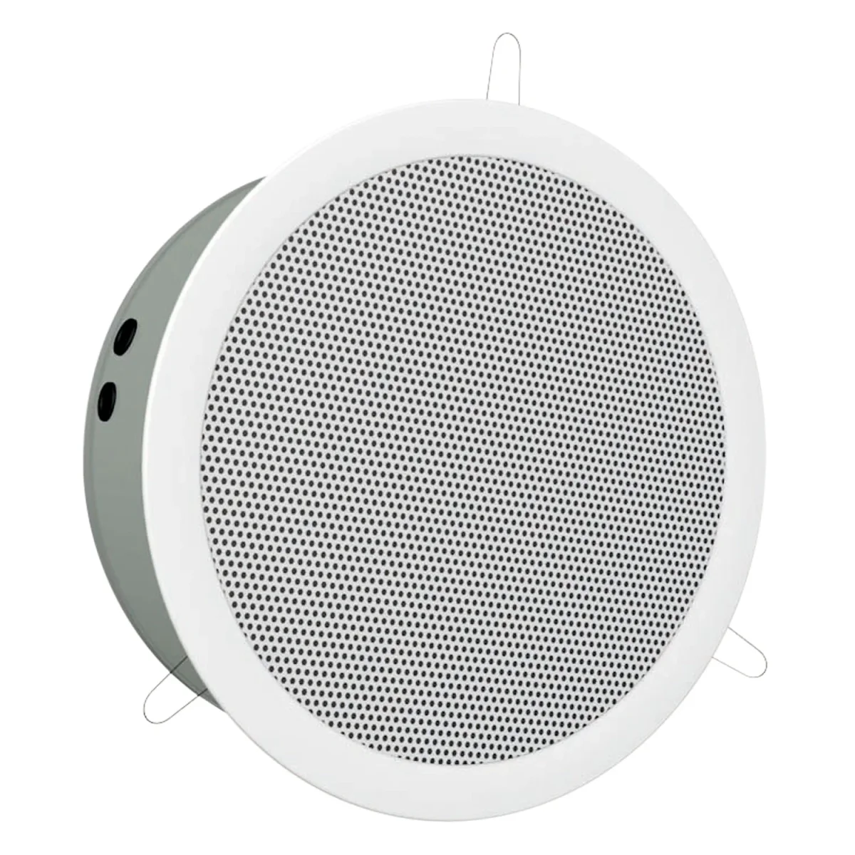 Deckenlautsprecher (RAL 9010) mit Metallgehäuse und ballwurfsicherem Ziergitter für den Einbau in Decken aller Art. Das 200 mm Hochleistungs-Fullrange-System erreicht einen sehr hohen Schalldruck von 98 dB 1 W/1 m. Durch das patentierte Einbausystem über Edelstahlfedern, kann der Lautsprecher blitzschnell montiert werden. Das Chassis ist imprägniert und ideal vor Feuchtigkeit geschützt. Anschluss über 4-polige Keramikklemme.