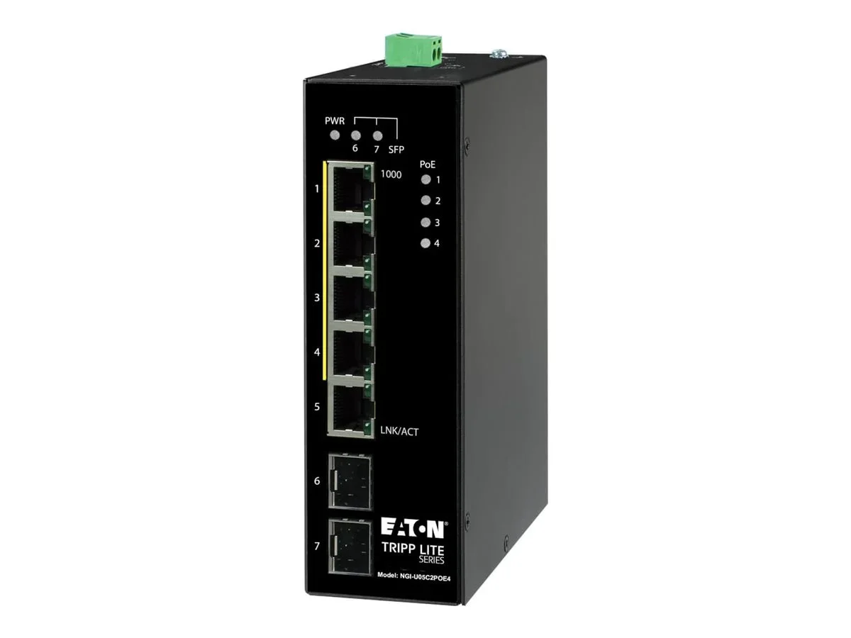 Entdecken Sie die Vorteile einer nahtlosen Konnektivität mit dem Eaton Tripp Lite Unmanaged Industrial Gigabit Ethernet Switch. Dieser Switch ist auf Zuverlässigkeit und Leistung ausgelegt und bietet eine robuste Lösung für industrielle Umgebungen. Mit einer Switching-Kapazität von 14 Gbit/s sorgt er für einen effizienten Datenfluss in Netzwerken und ist damit ideal für Anwendungen, die eine Hochgeschwindigkeits-Datenübertragung und Echtzeit-Kommunikation erfordern. Der Switch verfügt über vier 10/100/1000 Base-T PoE-Ports, einen 10/100/1000 Base-T-Port und zwei 1000Base-X SFP-Steckplätze und bietet damit vielseitige Anschlussmöglichkeiten für unterschiedliche Netzwerkanforderungen. Das robuste Metallgehäuse und das für die DIN-Schienenmontage geeignete Design machen ihn perfekt für industrielle Umgebungen und bieten Widerstandsfähigkeit unter extremen Bedingungen. Darüber hinaus unterstützt der Switch Power over Ethernet Plus (PoE+) mit einem 120-W-Budget, so dass Sie Geräte direkt über das Netzwerkkabel mit Strom versorgen können, was den Bedarf an zusätzlichen Netzteilen reduziert und die Installation vereinfacht. Dank der Konformität mit mehreren IEEE-Standards und intelligenten Netzwerkfunktionen wie Auto-Negotiation und MAC-Adressen-Lernen ist dieser Ethernet-Switch eine zuverlässige Wahl zur Verbesserung der Leistung und Effizienz Ihres Netzwerks.