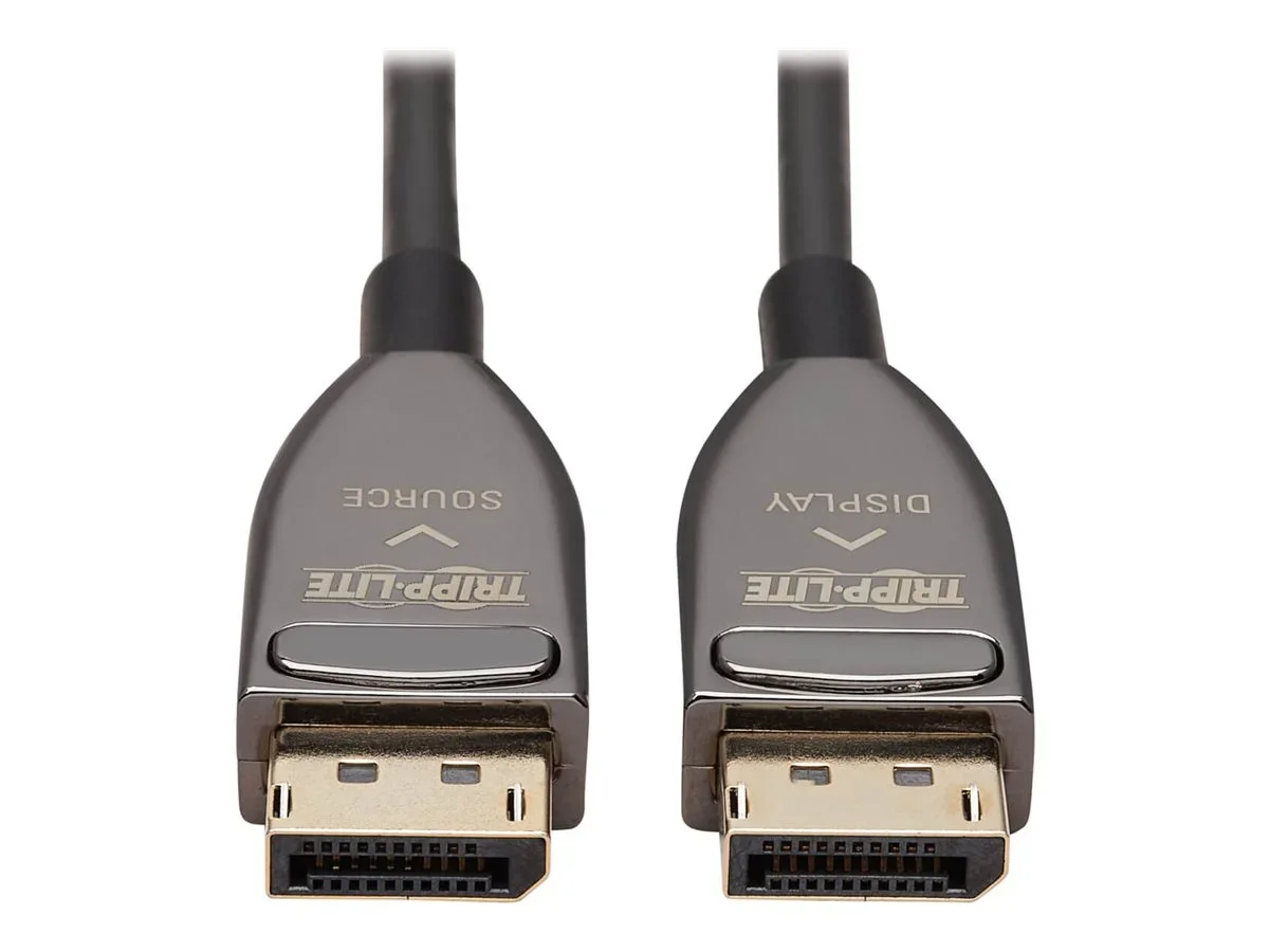 Das DisplayPort-Kabel der Eaton Tripp Lite Serie bietet Leistung und Klarheit für hochauflösende Displays. Mit einer maximalen Ausgangsauflösung von 7680 x 4320 und einer Bildwiederholrate von 60 Hz unterstützt es 8K UHD-Darstellungen und sorgt für eine lebendige Bildqualität für den professionellen und privaten Gebrauch. Die aktive optische Kabel (AOC)-Technologie ermöglicht größere Längen ohne Beeinträchtigung der Signalintegrität, was es zu einer guten Wahl für Setups macht, die eine Konnektivität über große Entfernungen erfordern. Dieses Kabel bietet HDR-Unterstützung und eine Gesamtbandbreite von 32,4 Gb/s, wodurch die Qualität der angezeigten Inhalte verbessert wird. Dank der 36-Bit-True-Color-Fähigkeit können Benutzer satte Farben und ein beeindruckendes Seherlebnis erwarten. Das Kabel ist mit den DisplayPort 1.4-Standards kompatibel und entspricht verschiedenen Vorschriften, einschließlich FCC, RoHS und REACH, um Zuverlässigkeit und Sicherheit für elektronische Anwendungen zu gewährleisten.