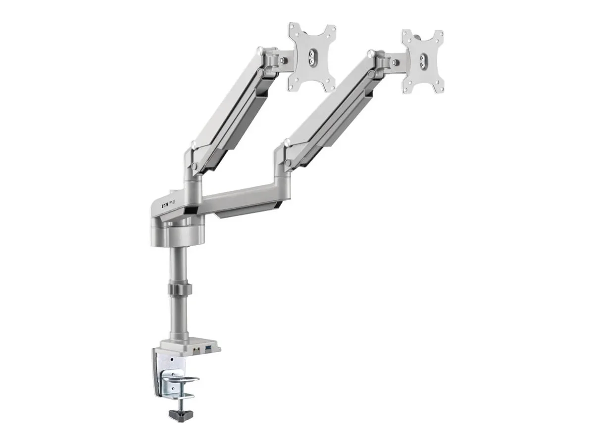Die Eaton Tripp Lite Dual-Display Flex-Arm-Halterung wurde für Benutzer entwickelt, die ihren Arbeitsbereich mit der Möglichkeit erweitern möchten, zwei LCD-Bildschirme von 17 bis 32 Zoll zu tragen. Die aus robustem Stahl gefertigte, vollbewegliche Halterung ermöglicht eine vielseitige Positionierung mit Neigungs-, Schwenk- und Dreheinstellungen, die optimale Betrachtungswinkel bieten. Das integrierte Kabelmanagement sorgt für eine aufgeräumte Installation, während die Optionen Tischklemme oder Tülle flexible Installationsmethoden für verschiedene Tischarten bieten. Die Halterung ist mit USB 3.0-Anschlüssen und zwei 3,5-mm-Audioanschlüssen ausgestattet und kann so verschiedene Multimedia-Anforderungen erfüllen, ohne zu stören. Das robuste Design unterstützt ein maximales Gewicht von 9 kg und ist damit für die meisten Monitoranordnungen geeignet. Bei diesem Produkt stehen Funktionalität und Bequemlichkeit an erster Stelle. Es verwandelt Ihren Arbeitsbereich effektiv in eine organisierte und komfortable Umgebung.