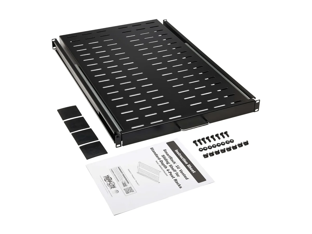 Das SmartRack Sliding Steel Rack Shelf von Eaton Tripp Lite bietet eine zuverlässige Aufbewahrungslösung für wichtige Geräte in einem kompakten 1U-Design. Das aus kaltgewalztem Stahl gefertigte Regal garantiert Langlebigkeit und Stärke und trägt bis zu 23 kg Gewicht. Das belüftete Design verbessert die Luftzirkulation, um optimale Temperaturen für die auf dem Regal platzierten Geräte zu gewährleisten. Die Pulverbeschichtung verleiht dem Regal ein professionelles Aussehen und macht es widerstandsfähig gegen Abnutzung. Im Lieferumfang ist alles enthalten, was für die Installation benötigt wird, einschließlich M6-Käfigmuttern, Schrauben und Unterlegscheiben, was die Einrichtung einfach und effizient macht.