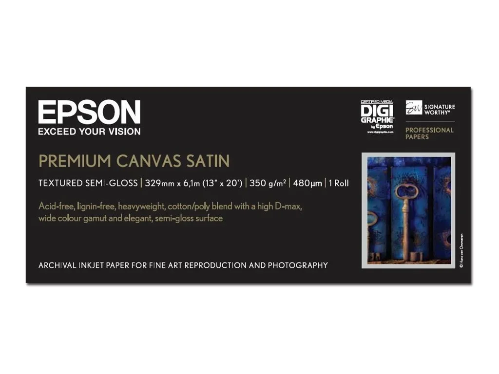 Ob es sich um Fotoporträts oder Kunstreproduktion handelt, Premium Canvas Satin stellt die anspruchsvollsten Profis zufrieden, indem es die feinste Bildqualität bietet und gleichzeitig ein Medium für erhöhte Kreativität darstellt. Aus einer widerstandsfähigen Mischung von 65% Polyester und 35% Baumwolle, setzt diese einmalige, schwere Qualitätsleinwand ein dichtes 2-1Gewebe ein, ideal für fotografische und Kunstreproduktionen. Es bietet eine Beschichtung mit hoher Auflösung, flexibel genug, ohne durchzuhängen gedehnt zu werden, und weist eine feine Struktur für wahrhaft künstlerisches Aussehen und Griffigkeit auf.<br /><br />Zusammen mit wunderbarer Farbreproduktion erstellt Premium Satin Leinwand eine hochglänzende Oberfläche und ist sofort trocknend und wasserfest für alle Anwendungen, die die höchste Bildqualität und ein äußerst langes Displayleben erfordern.<br /><br />Da alle Farbstoffe, Pigmente und Papiere sich im Laufe der Zeit verändern, kann Epson dieses Produkt nicht gegen Farbänderung und Bleichbeständigkeit garantieren. Epsons Haftung für irgendwelche Defekte bei der Herstellung und Verpackung ist auf die Kosten für die Ersetzung dieses Produkts begrenzt. Technische Daten können ohne vorherige Benachrichtigung geändert werden.<br /><br />Dieses Papier wurde für Digigraphie zertifiziert und von unabhängigen Laboratorien getestet, um die Stabilität der Ausdrucke über längere Zeit hinweg zu gewährleisten. Die komplette Liste zertifizierter Papiere ist hier zu finden.