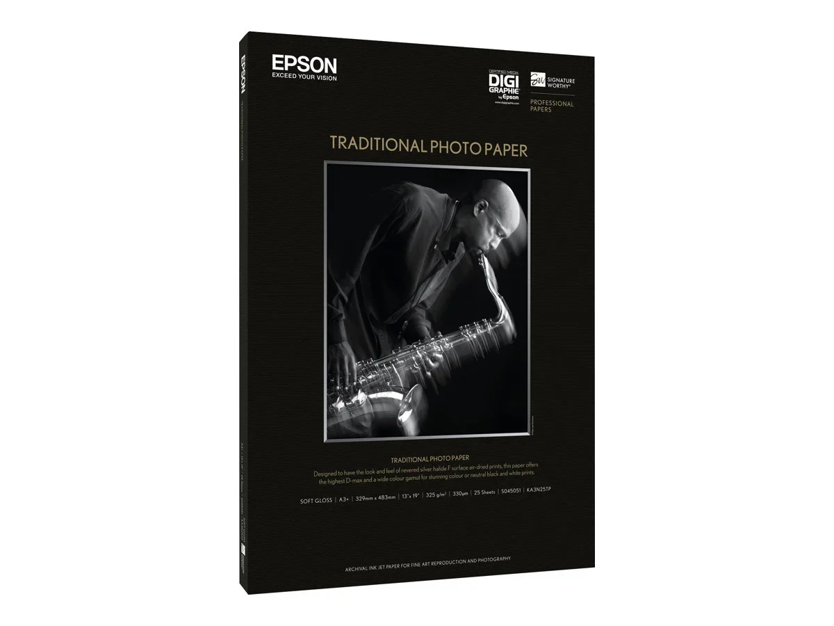 Epson Traditional Photo Paper ist ein Durchbruch in der Papierherstellung. Es wurde exklusiv für den Gebrauch mit Epsons UltraChrome K3 Tinte entworfen, und zwar in Zusammenarbeit mit vielen der führenden Profifotografen in der Branche, um sicherzustellen, dass es deren hochanspruchsvollen Anforderungen genügt.Viele, die zur Entwicklung von Traditional Photo Papers beigetragen haben, bemerkten, dass es sie an die geschätzten Silberhalogenidmedien erinnerte und zudem größere kreative Kontrolle bot, aufgrund der außergewöhnlichen D-Max und Tonwertübergabe in Schwarzweiß. Außerdem können Sie hervorragende Farben auf dem gleichen Papier ausdrucken, etwas was mit den traditionellen faserbasierten Papieren nicht möglich war.Beim Kombinieren der Kunstform traditioneller Fotografie mit der Einfachheit und Kontrolle digitaler Ausgabe, bietet dieses einmalige Medium die gleichen tiefen Schwarztöne, feinen Tonabstufungen und langlebigen Resultate, wie die Dunkelkammerpapiere früherer Generationen. Seine Faserbasis verfügt über eine gehaltvolle Oberfläche, eine gleichmäßige Farbtiefe und weichen Glanz, ideal für die exquisite Farbwiedergabe oder Erstellung neutraler Schwarzweiß-Prints, die Look und Griffigkeit traditioneller Faserpapiere beibehalten.Wie alle innovativen Medien von Epson, ist dieses Papier gefertigt, Ihnen die höchstmögliche Auflösung und Farbsättigung zu bieten. Wie immer garantieren Epsons Verbrauchsmaterialien Epson Qualität.
