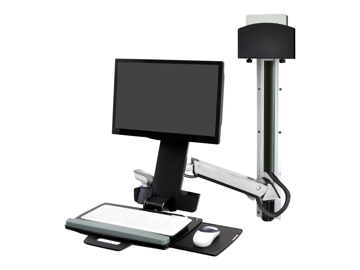 Ergotron Sit-Stand Combo System Mit CPU-Halter klein - Befestigungskit (CPU-Halter, 2 Schienenabdeckungen, 2 Kabelkanäle, Handgelenkkissen, einstellbarer Monitorarm, VESA-Halterung, Wandschiene 34", Montagesystem mit CPU-Halterung und Armen, Tastaturablage mit linker/rechter Mausablage, Ablage für Barcode-Scanner und Maus, Combo Schwenkarm) - für LCD-Display / PC-Ausrüstung - kleiner CPU-Halter - Aluminium, hochwertiger Kunststoff - Polished Aluminum - Bildschirmgröße: bis zu 61 cm (bis zu 24 Zoll)