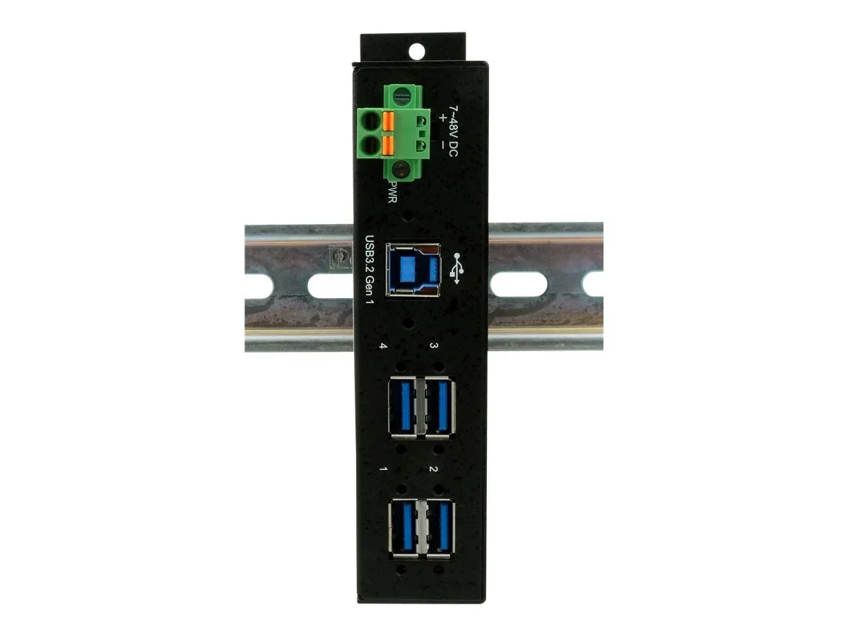 Der robuste, Industrie-taugliche EX-1185HMVS-2 USB-Hub mit vier USB 3.2 Gen1 (vorher genannt USB 3.0) Ausgängen verschraubbar und 15KV ESD Überspannungs-Schutz kann an die Wand oder auf einer Trägerschiene installiert werden. Er wird an einen Computer oder Server mit dem USB 3.2 Gen1 Kabel angeschlossen. Es wird die Hi-Speed USB 3.2 Gen1 Datenübertragungsrate von bis zu 5Gbit/s unterstützt und ist abwärtskompatibel bis USB 1.1. Er kann mit USB-Bus-Power (7-48V) oder über eine zwei drahtige Klemmleiste, wo die Drähte nur noch gesteckt werden, mit Strom versorgt werden.