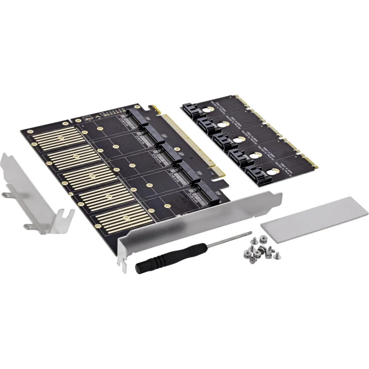 - Inklusive Zubehör für sofortigen Einsatz: Lieferung mit fünf M.2-zu-SATA-Adaptern, Kühlkörpern, Kabeln und Low-Profile-Blech – für vielseitige Einbauszenarien.