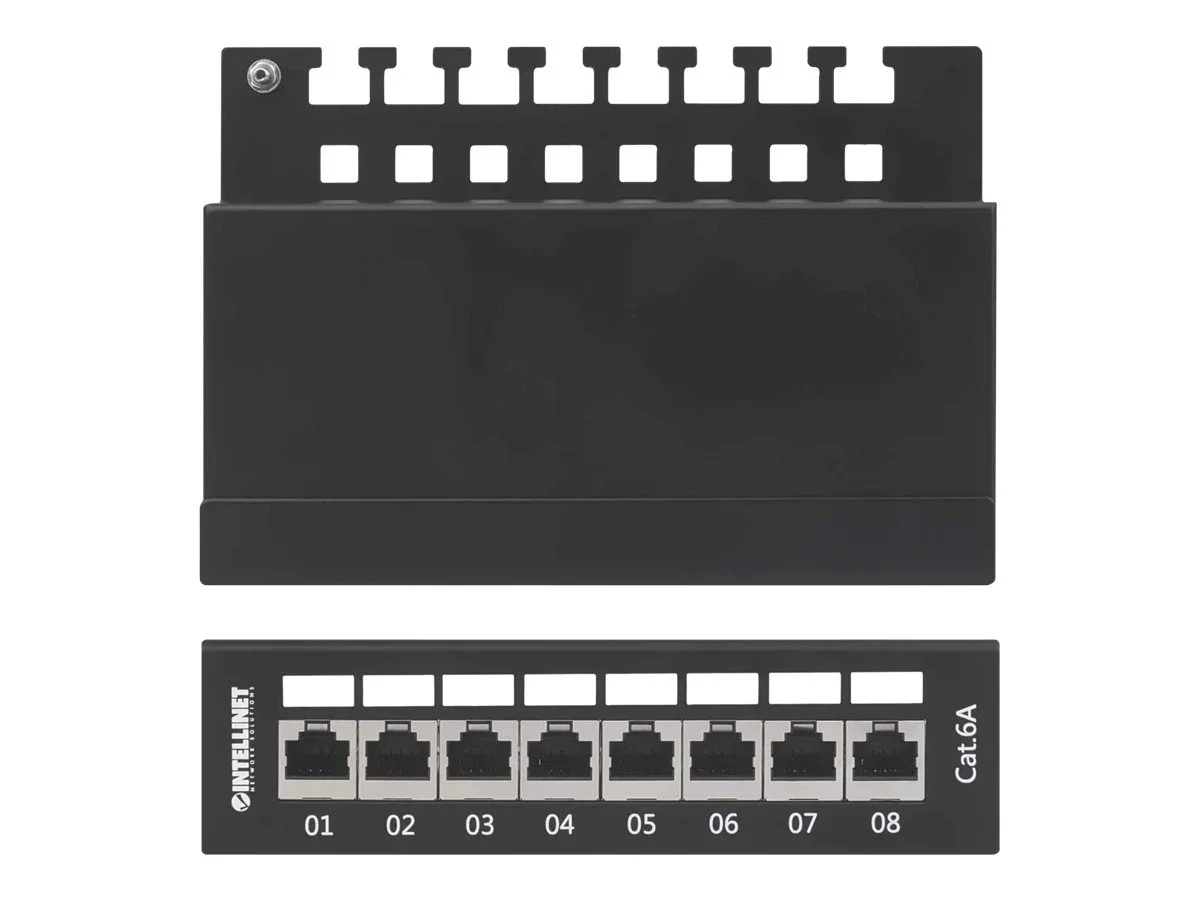 INTELLINET 8-Port Cat6a Patchpanel geschirmt FTP Desktop Klemmleisten mit 90 Grad abgewinkelten Kabeleinfuehrungen schwarz