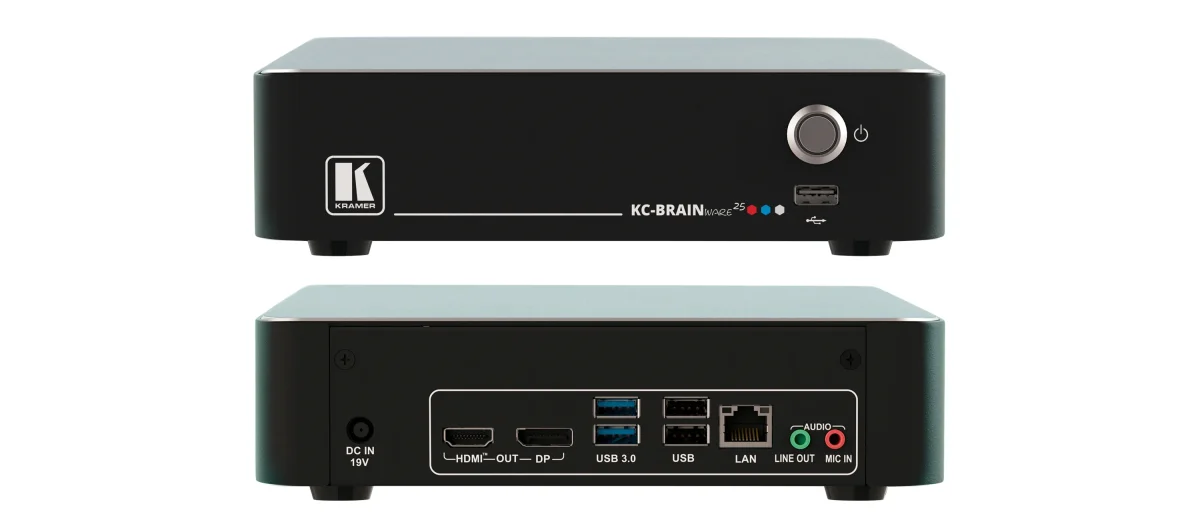 KC−BRAINware−25 is a hardware platform with 25 instances of Kramer BRAINware software already installed on the device. KC−BRAINware−25 is designed to maximize the features and benefits of Kramer BRAINware for controlling up to 25 standard spaces (e.g. a standard space could include a scaler, monitor, lighting system, touch panel and keypad).