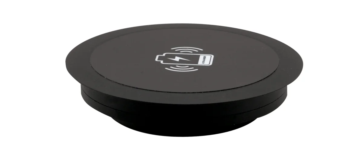 KWC−1 (Kramer Wireless Charging) ist ein eingebauter Tischladepunkt, mit dem Sie Ihr mobiles Gerät aufladen können, indem Sie es einfach auf die Ladestation stellen. Wenn Ihr Mobilgerät kein kabelloses Laden bietet, können Sie es an einen der im Lieferumfang enthaltenen Empfänger anschließen und es dann an die Ladestation stellen. Beachten Sie, dass zusätzliche Empfänger separat erworben werden können.