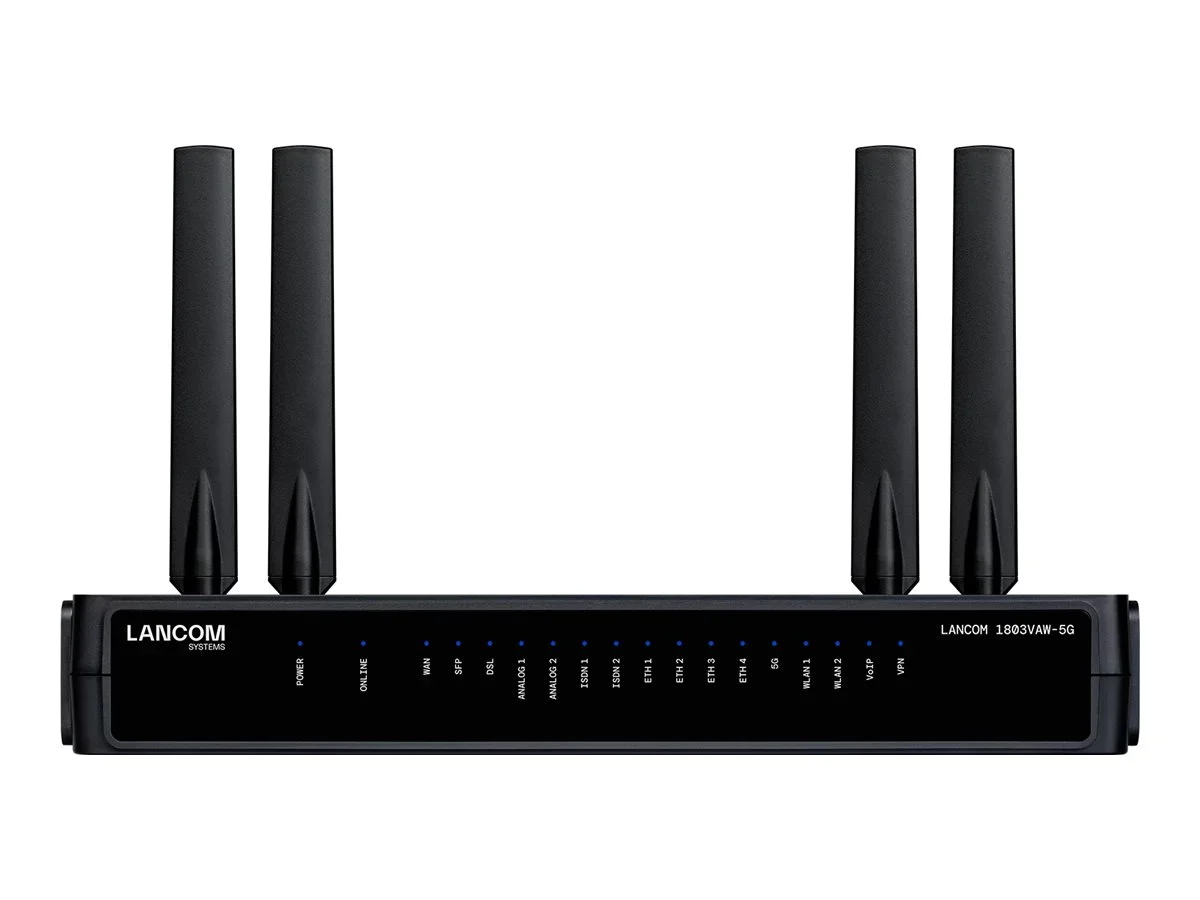 Der LANCOM 1803VAW-5G wurde entwickelt, um ein optimales Netzwerkerlebnis zu bieten, indem er 5G-Fähigkeiten mit zuverlässiger VDSL-Leistung und Wi-Fi 6-Technologie kombiniert. Dieses Gerät verbindet kabelgebundene und kabellose Konnektivität und bietet Datenübertragungsraten von bis zu 1200 Mbit/s, um anspruchsvolle Anwendungen und gleichzeitige Verbindungen zu unterstützen. Mit integrierter Voice-over-IP-Unterstützung (VoIP) und Echounterdrückung verbessert dieser Router die Kommunikation und Effizienz sowohl für den geschäftlichen als auch für den privaten Gebrauch.