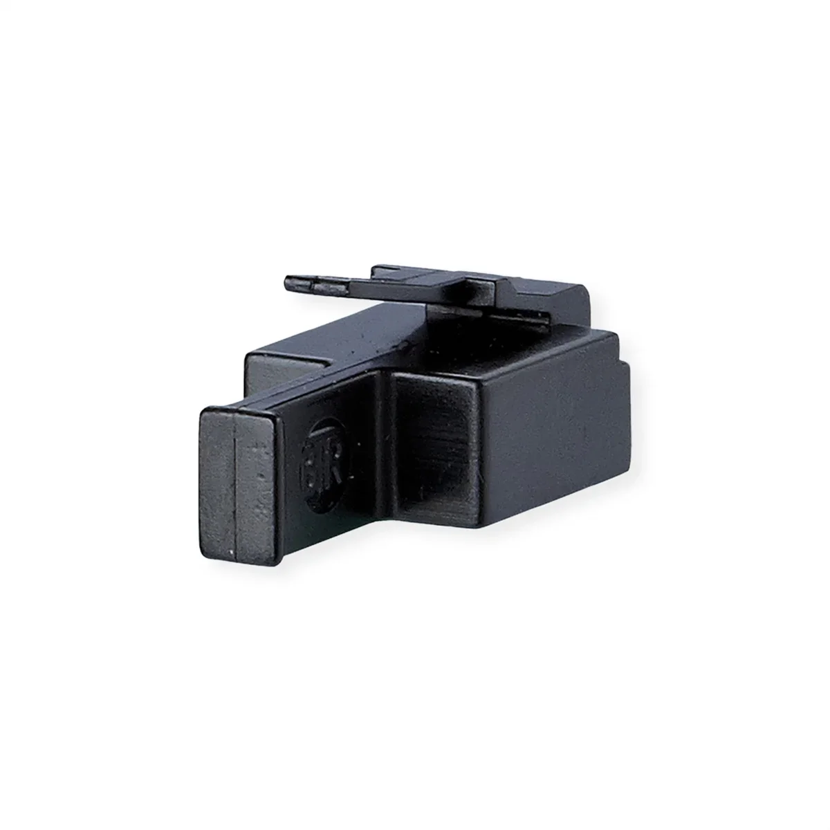 Von Hand lösbare Verriegelung zum staubgeschützten Verschließen von nicht belegten RJ45-Buchsen, mit Griff.