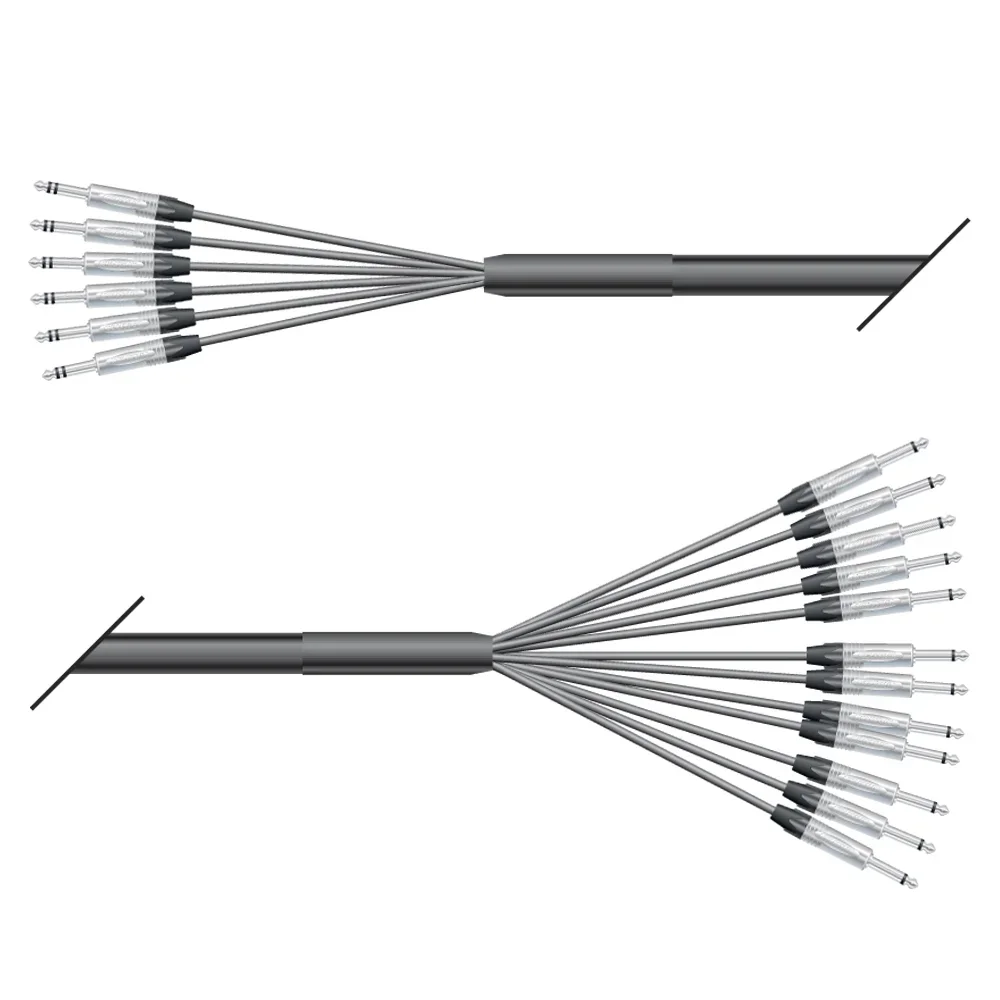 Die folgenden Kabel sind spezielle Insert Looms für Mischpulte mit unsymmetrischen Inserts, d.h. Send und Return sind auf einer gemeinsamen Stereoklinkenbuchse im Mischpult vorhanden. Um diese dann mit einem Effektgerät zu verbinden, muss man das Signal auf 2 einzelne Stecker verteilen. Genau das machen unsere Looms. Dies bedeutet unweigerlich, dass auf einer Seite z.B. 8 Stereoklinken sind, auf der anderen Seiten dann passend dazu 16 Monoklinken. Oder die andere Seite ist mit 8 XLR male und 8 XLR female versehen.