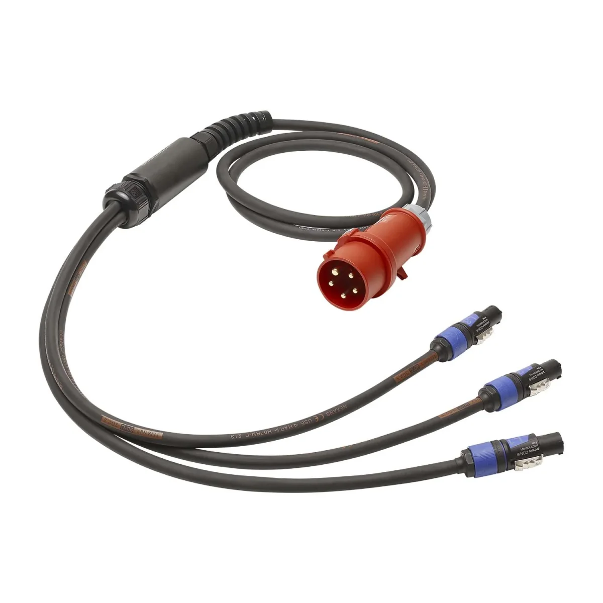 Wir liefern die Last-Verteil-Systeme auf einer Seite mit 5-pol CEE-Kabelstecker von MENNEKES, auf der anderen in verschiedenen Versionen, siehe Tabellen. Als Spleißkabel verwenden wir die Kabelausführung 3 x 2,5 mm².
