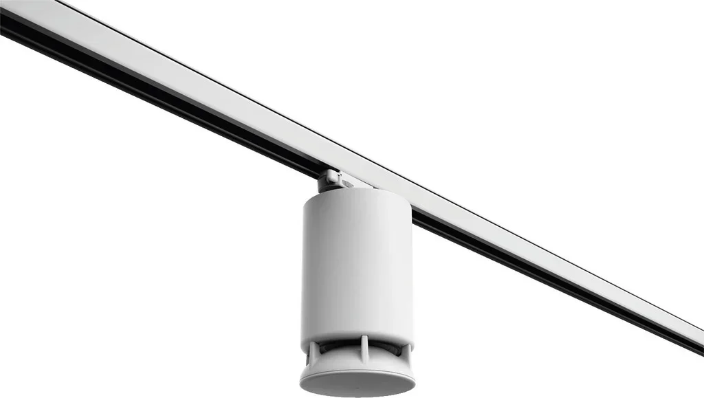 Spottune OMNI TRACK-Lautsprecher - drahtloser 360-Grad-Lautsprecher für den Einsatz und die Montage an 3-Phasen-Hochvolt-Lichtschienen mittels eines Global-Track-Adapters. Der Spottune OMNI TRACK-Lautsprecher ist akustisch so konzipiert, dass der Schall in alle Richtungen gleichmäßig abgestrahlt wird, anstatt wie herkömmliche Lautsprecher auf eine frontale Hörposition optimiert zu sein. Die 360-Grad-Schallabstrahlung empfiehlt sich in Umgebungen, in denen der Schall gleichmäßig verteilt werden soll, um im gesamten Raum ein einheitliches Hörerlebnis zu schaffen. Das Ergebnis ist ein verbesserter Hörkomfort und ein einheitliches, raumfüllendes Klangbild.