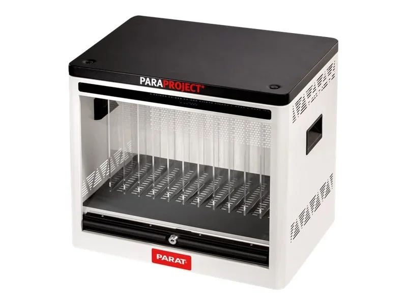 Das Multitalent PARAPROJECT Cube C12 ist ein unverzichtbarer Begleiter, wenn es um die Aufbewahrung von iPads bis zu 12? geht. Ausgestattet mit 12 Lightning -Kabeln, finden genauso viele Geräte in vorgesehenen Einschubfächern ihren Platz. Der Innenraum des Cubes ist mit einer rutschfesten Unterlage versehen und hält die iPads sicher an Ort und Stelle. Zusätzlichen Schutz bietet der robuste Korpus mit einer platzsparenden und abschließbaren Jalousie an der Frontseite. Durch die smarte LED-Anzeige mit Sichtfenster hat man stets den Ladestatus der Endgeräte im Blick. Der PARAPROJECT Cube C12 bietet mit seiner 45 W Ausgangsleistung pro Port zudem die beiden praktischen Funktionen PowerDelivery und QuickCharge. Damit die iPads während des Ladevorgangs nicht überhitzen, sind im Cube mehrere Lüftungsschlitze sowie eine aktive Lüftung integriert, welche sich dann einschalten, wenn die Innentemperatur über 40/45°C liegt. Einen stabilen Halt garantieren die 4 gummierten Bodengleiter an der Unterseite des Cubes. Seitlich befinden sich 2 komfortable Griffmulden, die den Transport der Aufbewahrungslösung PARAPROJECT Cube C12 erleichtern.