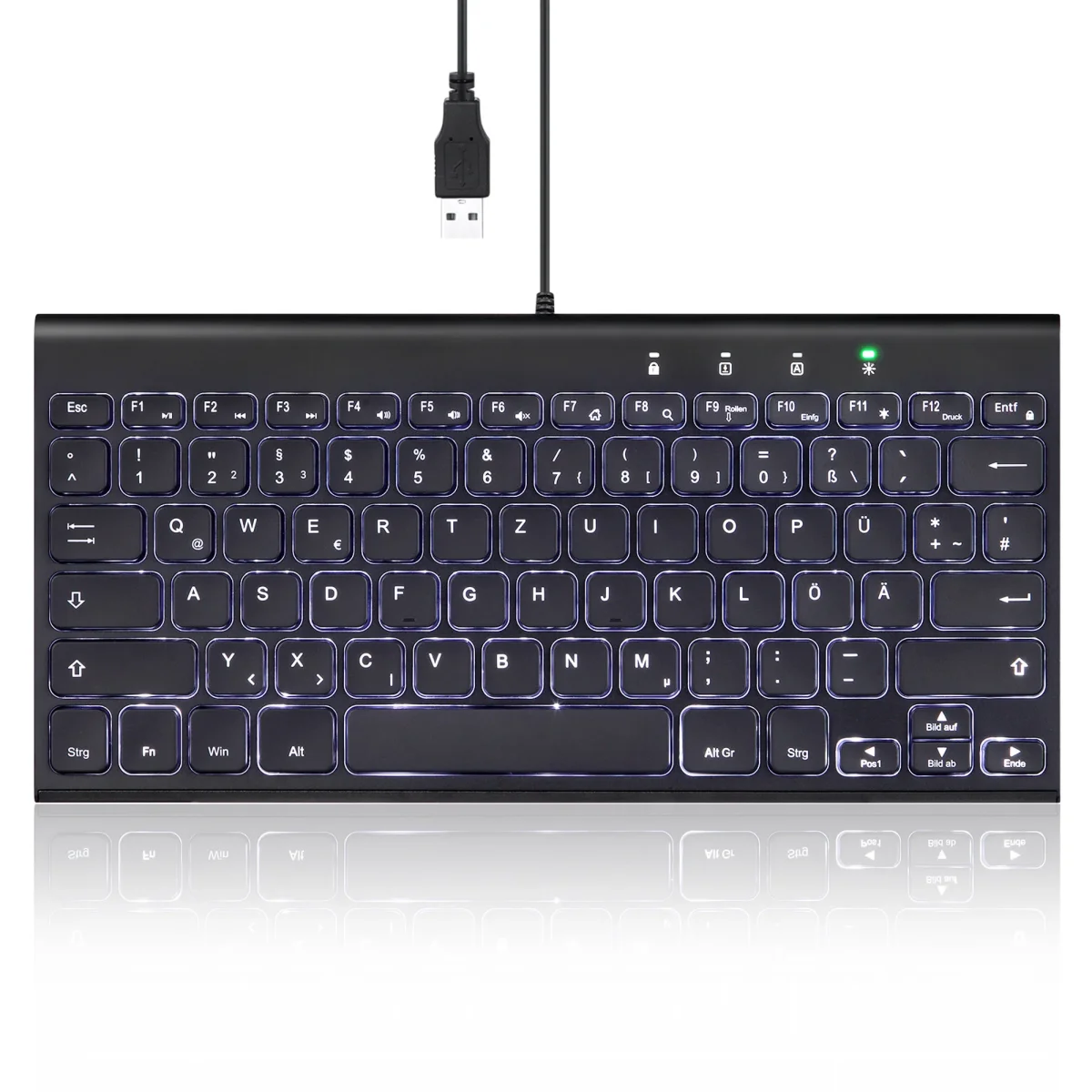 Kompaktes Design - Mini Tastatur Design ohne Ziffernblock, welches Platz auf dem Schreibtisch spart und komfortabel istTippen Bei Tag Und Nacht - Einfaches Tippen im Dämmerlicht oder dunklen Umgebung mit LED HintergrundbeleuchtungPraktische Hot Keys - Einfaches Navigieren mit den 10 intuitiven Hot Keys auf einer kompakten TastaturLeise Scherentastenstruktur - Komfortable und stabile Tasten mit flachem Profil ähnlich wie bei Laptoptasten. Die Scherenstrukturtasten bieten ein ebenes Tastengefühl beim Tippen.Abmessungen 282 x 135 x 14 mmGewicht 335 gHintergrundbeleuchtung JaKabellänge 180 cmSchnittstelle USBFarbe schwarzMediatasten 10Systemvoraussetzung Windows 7/8/10/11Betriebstemperatur 0 bis 40°CLagertemperatur -15 bis 60°CStromverbrauch < 100~350mA (Hintergrundbeleuchtung aus~ein)USB Betriebsspannung 4,25~5,25 VDCWerkstoff ABSTastenfahrweg 2,0+0,32 mm