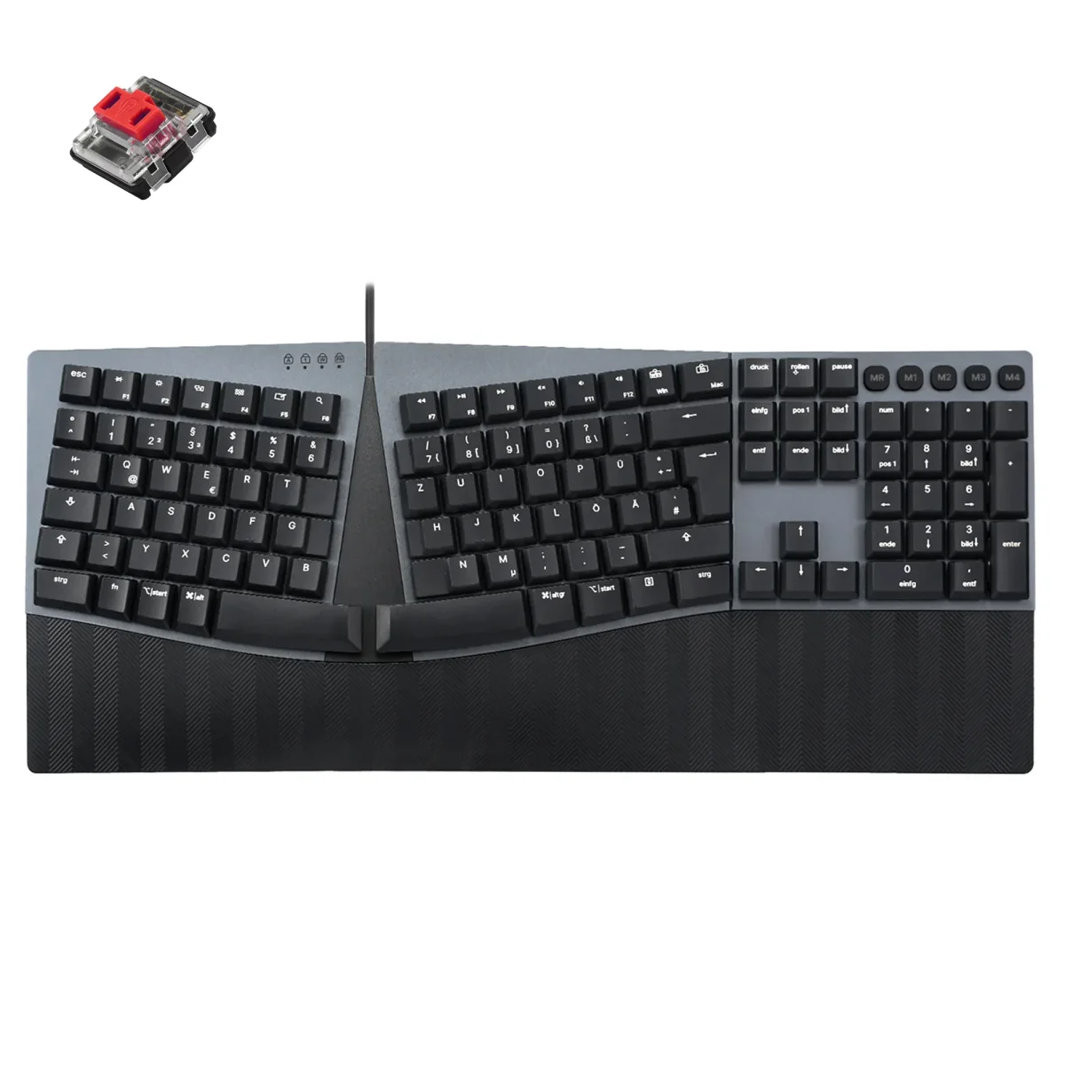 Ergonomisches Design: Eine mechanische Tastatur mit geteiltem Tastenrahmen und gebogenem Design fördert eine bessere Körperhaltung, indem sie Handgelenk und Arme in die natürlichste Tipphaltung bringt.