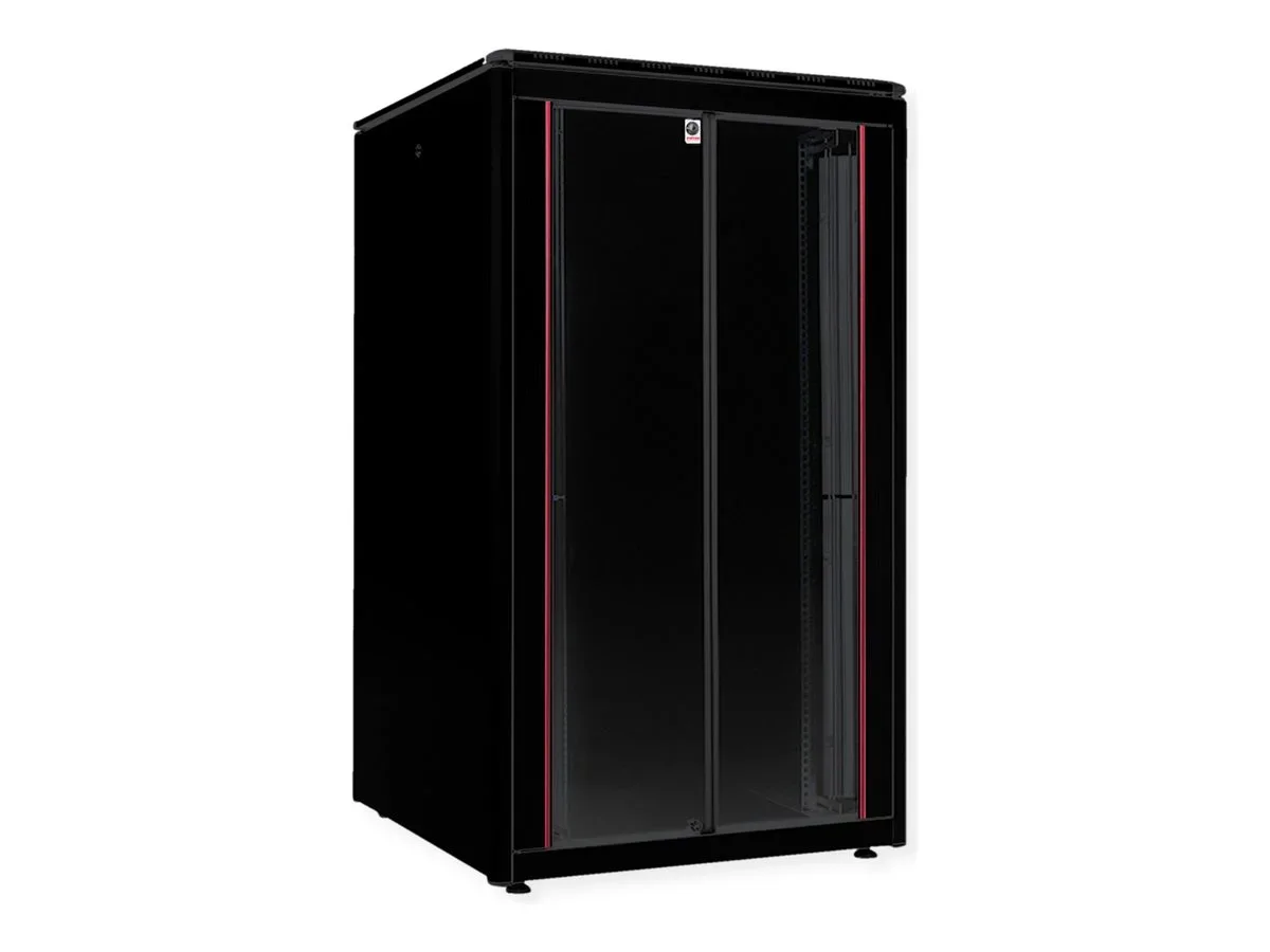 ROLINE 19 Zoll Netzwerkschrank Pro 26 HE 800x800 BxT Glastür schwarzDie Netzwerkschränke der ROLINE Pro Serie wurden entwickelt, um eine besonders komfortable und flexible Netzwerkverkabelung zu ermöglichen. Mit Bürsteneinlässen im Dach- und Bodenbereich (ab 26HE und 800 mm Schrankbreite), einem aufschiebbaren Einlass im Bodenchassis mit Moosgummidichtung sowie Bürstenleisten ober- und unterhalb der Rücktür (ab 26HE) bieten sie vielseitige Einsatzmöglichkeiten für verschiedene Anwendungsszenarien. Vertikale Kabelführungskanäle mit Blende, installiert neben den Profilschienen (ab 800 mm Schrankbreite), vervollständigen das Design. Ein abgesetzter, abnehmbarer Deckel mit Lüftungsschlitzen verbessert die Luftzirkulation und ermöglicht eine einfache Installation eines Lüftermoduls. Die Lüftereinheit kann von oben ein- und ausgebaut werden, ohne dass die Komponenten im Inneren betroffen sind. Im Inneren sind zwei Paar galvanisierte 19"-Profilschienen verbaut, die in beide Richtungen ablesbar und in der Tiefe verstellbar sind. Sie sind zudem mit zusätzlichen Tiefenstreben im Schrank verbunden. Jeder Schrank besteht aus einer robusten Stahlkonstruktion mit einer Materialstärke von bis zu 1,5 mm Stahlblech.Die Farbgebung erfolgt mittels elektrostatischer Pulverbeschichtung in den Standardfarben Grau (RAL 7035) und Schwarz (RAL 9005). Modular abnehmbare Seitenwände und Türen verbessern die Zugänglichkeit. Ein Wechsel des Türanschlags ist möglich. Die Schränke sind bei Bedarf auch vollständig zerlegbar.