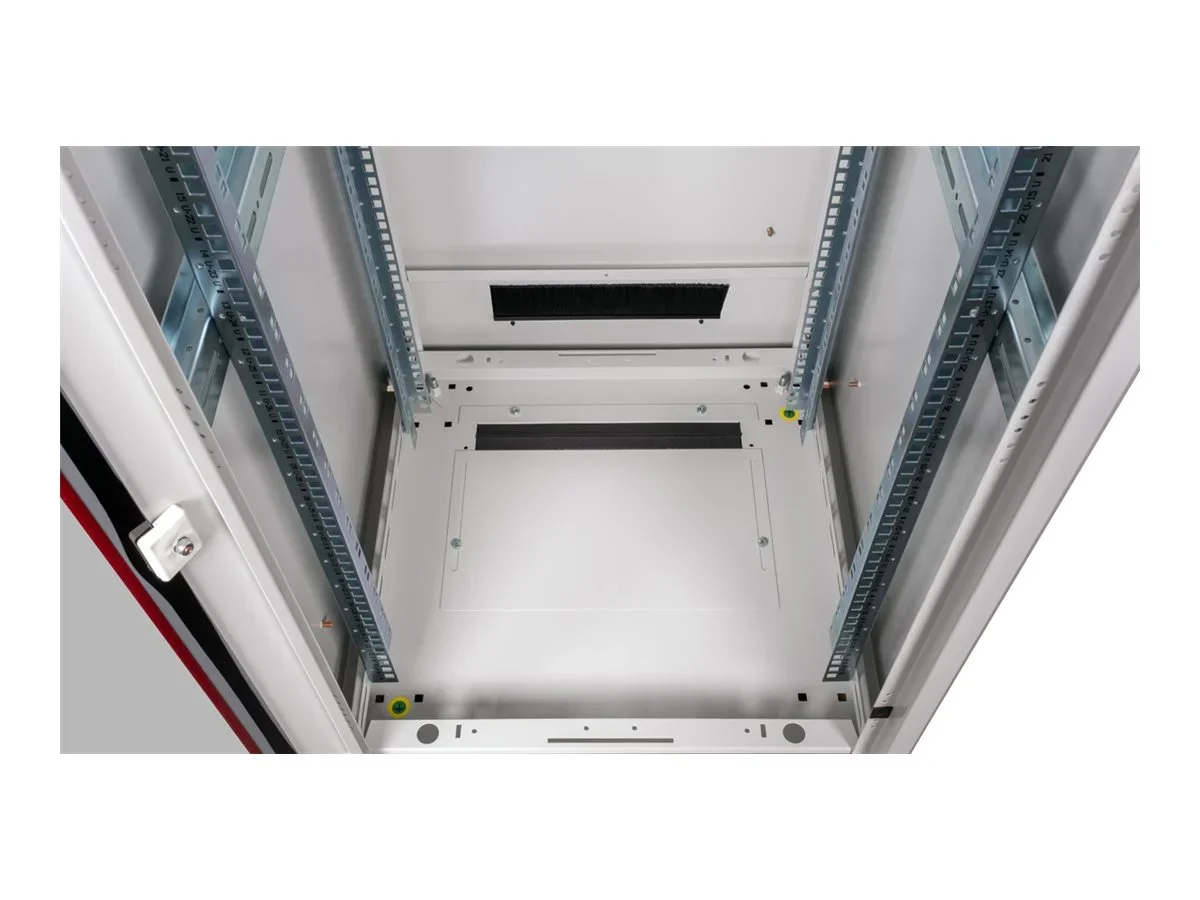 ROLINE 19 Zoll Netzwerkschrank Pro 36 HE 600x600 BxT Glastür grauDie Netzwerkschränke der ROLINE Pro Serie wurden entwickelt, um eine besonders komfortable und flexible Netzwerkverkabelung zu ermöglichen. Mit Bürsteneinlässen im Dach- und Bodenbereich (ab 26HE und 800 mm Schrankbreite), einem aufschiebbaren Einlass im Bodenchassis mit Moosgummidichtung sowie Bürstenleisten ober- und unterhalb der Rücktür (ab 26HE) bieten sie vielseitige Einsatzmöglichkeiten für verschiedene Anwendungsszenarien. Vertikale Kabelführungskanäle mit Blende, installiert neben den Profilschienen (ab 800 mm Schrankbreite), vervollständigen das Design. Ein abgesetzter, abnehmbarer Deckel mit Lüftungsschlitzen verbessert die Luftzirkulation und ermöglicht eine einfache Installation eines Lüftermoduls. Die Lüftereinheit kann von oben ein- und ausgebaut werden, ohne dass die Komponenten im Inneren betroffen sind. Im Inneren sind zwei Paar galvanisierte 19"-Profilschienen verbaut, die in beide Richtungen ablesbar und in der Tiefe verstellbar sind. Sie sind zudem mit zusätzlichen Tiefenstreben im Schrank verbunden. Jeder Schrank besteht aus einer robusten Stahlkonstruktion mit einer Materialstärke von bis zu 1,5 mm Stahlblech.Die Farbgebung erfolgt mittels elektrostatischer Pulverbeschichtung in den Standardfarben Grau (RAL 7035) und Schwarz (RAL 9005). Modular abnehmbare Seitenwände und Türen verbessern die Zugänglichkeit. Ein Wechsel des Türanschlags ist möglich. Die Schränke sind bei Bedarf auch vollständig zerlegbar.